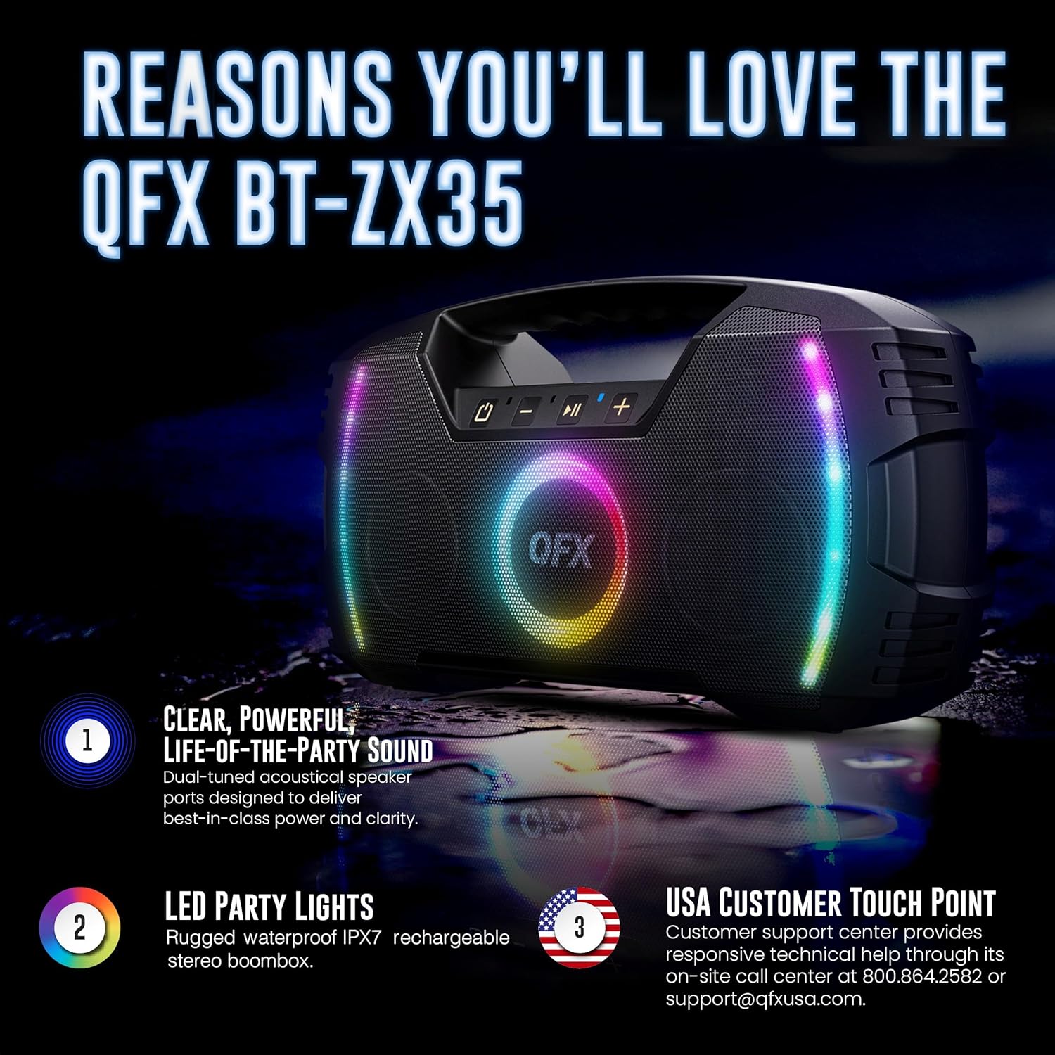 Powerful & Portable Waterproof All Terrain Bluetooth Speaker with Deep Bass, LED Party Lights, Fast USB-C Charging, FM Radio, AUX – QFX BT-ZX35