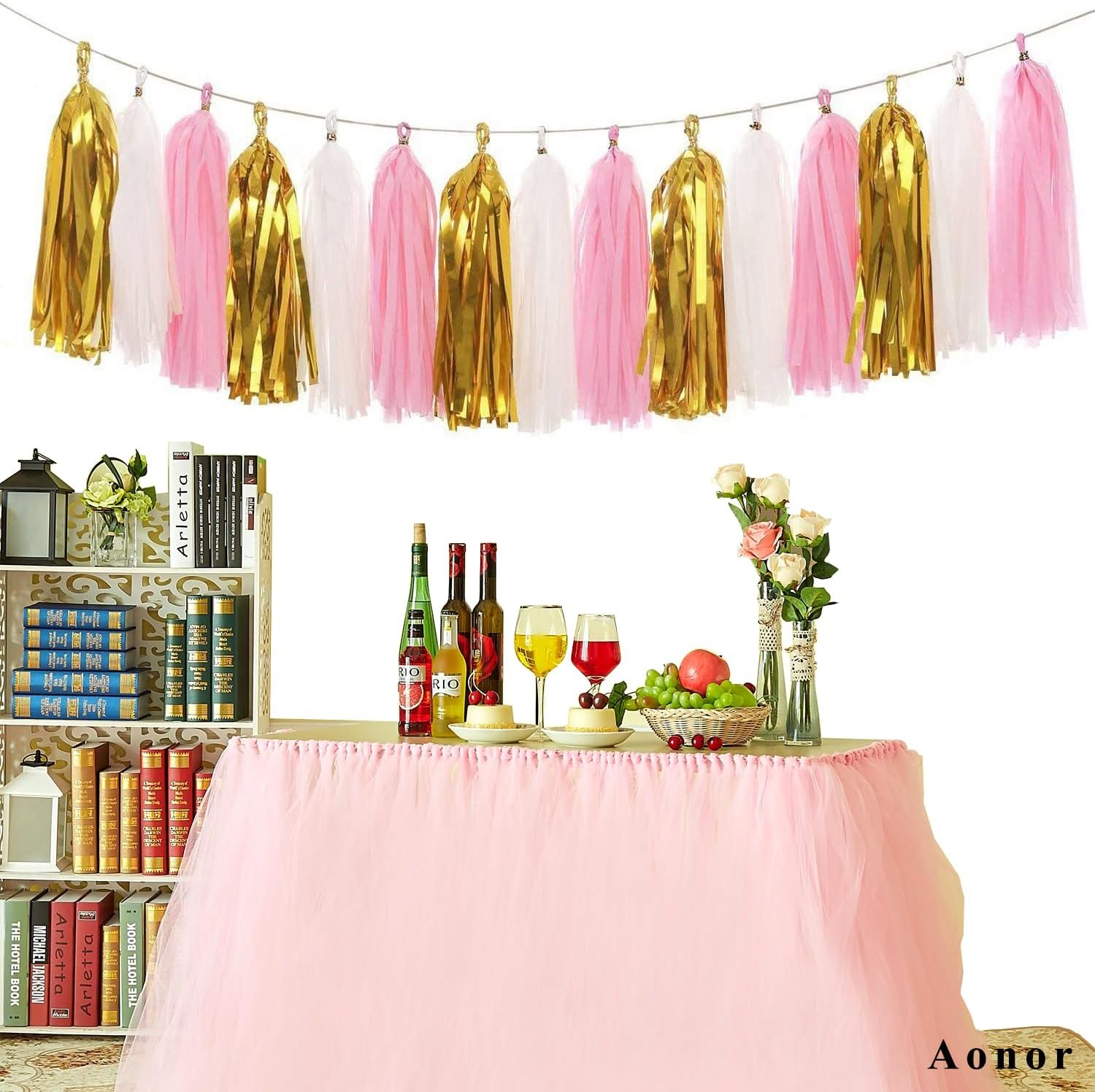 - PACKAGING, One garland includes: 15 tassels (14 Inch Long Each) + Instruction + String + Cable Ties for hanging these tassels , 5 each of White, Pink and Metallic Gold. (each color contains 5 tassels (separate them))