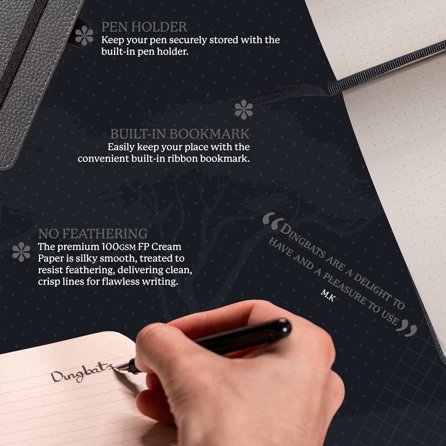 - HIGHEST-QUALITY WRITING PAPER: Dingbats Grey Elephant Medium A5 Notebook Journal has 192 pages-96 sheets of no bleed, smooth writing, Cream 100gsm, acid-free fountain-pen friendly, perforated plain paper in a flat lay design
