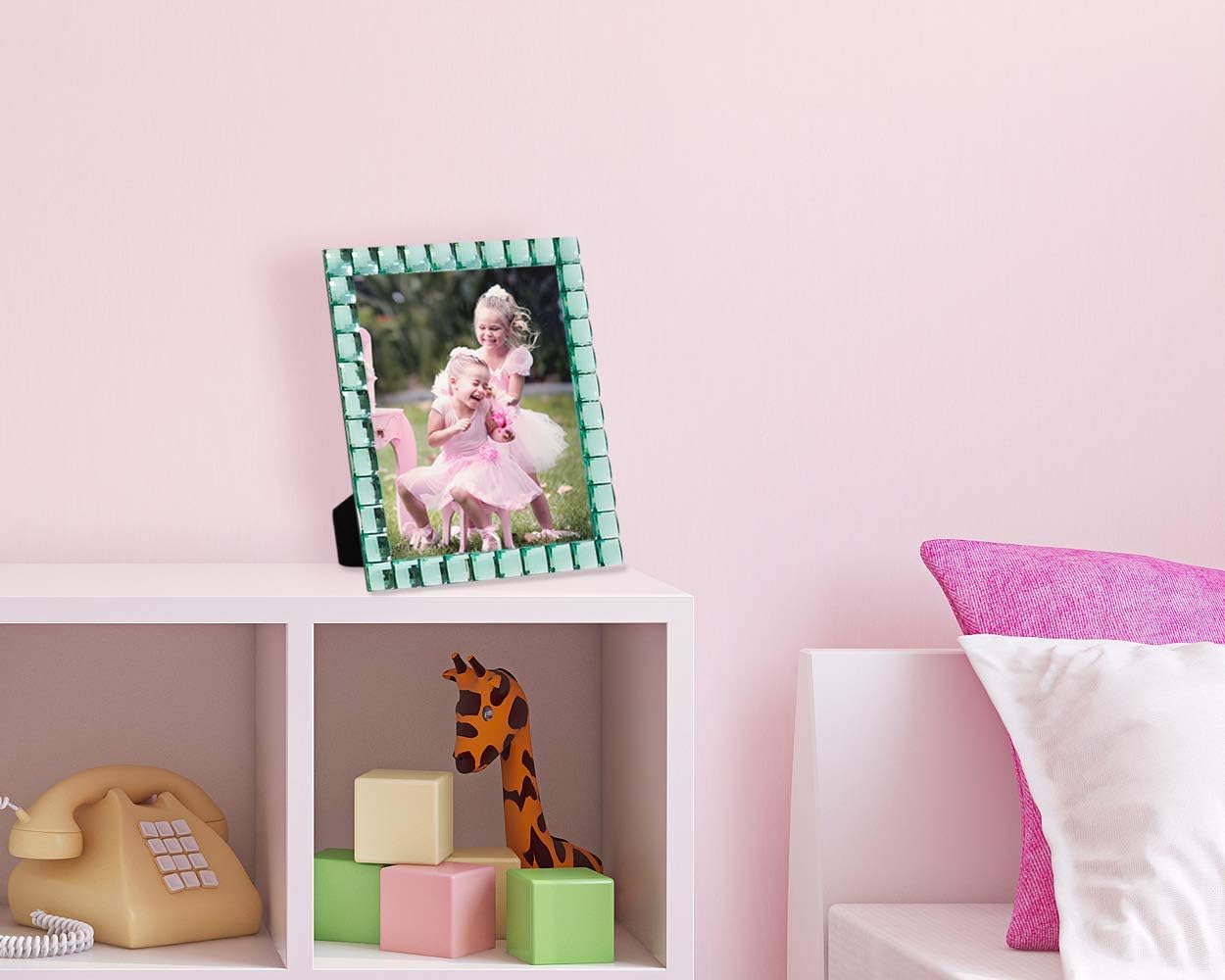 - FRAME DESIGN: This glitzy glamorous jewel frame with its radiant stones has a retro-inspired look, and its reflective nature brings sparkle to your photos. It is chic and unique and makes the vibrant colors really add a touch of light to your living room and the perfect amount of glam to your desk