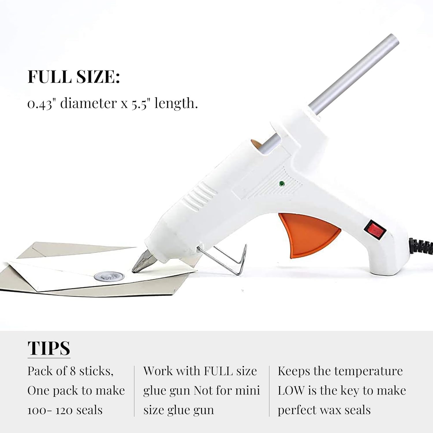 - EASY TO APPLY - Easily use together with a low-temp large standard 0.44" glue gun. Not designed for mini glue guns! If you plan to seal dozens of envelops, this is the most efficient method. To avoid the wax stuck to the stamp, you may put stamp on an ice pack in between every 4-5 impressions. Please remember the glue gun was designed for glue stick which requires a much higer melting temperature than the wax, so to keep the temperature low is the key.