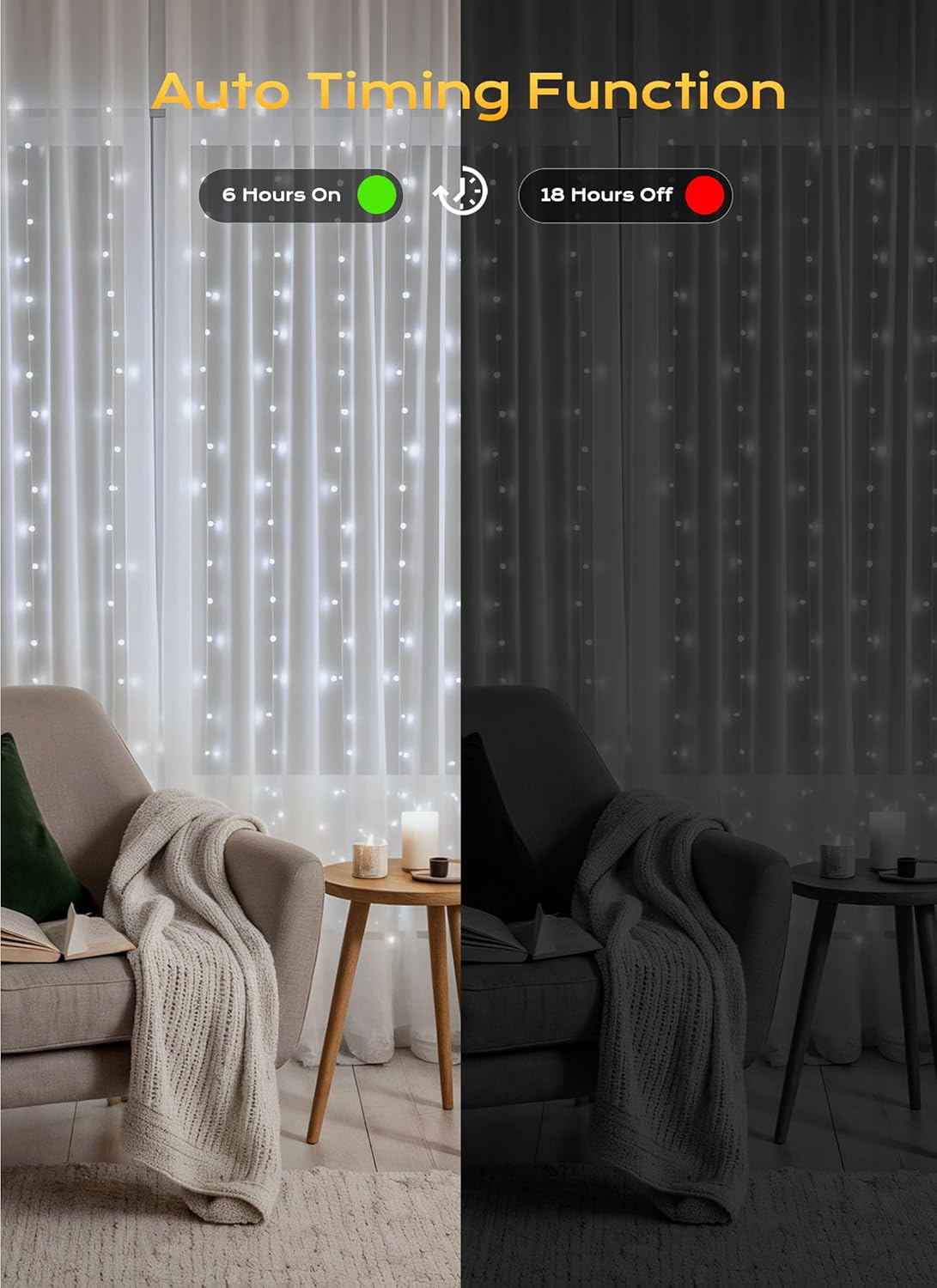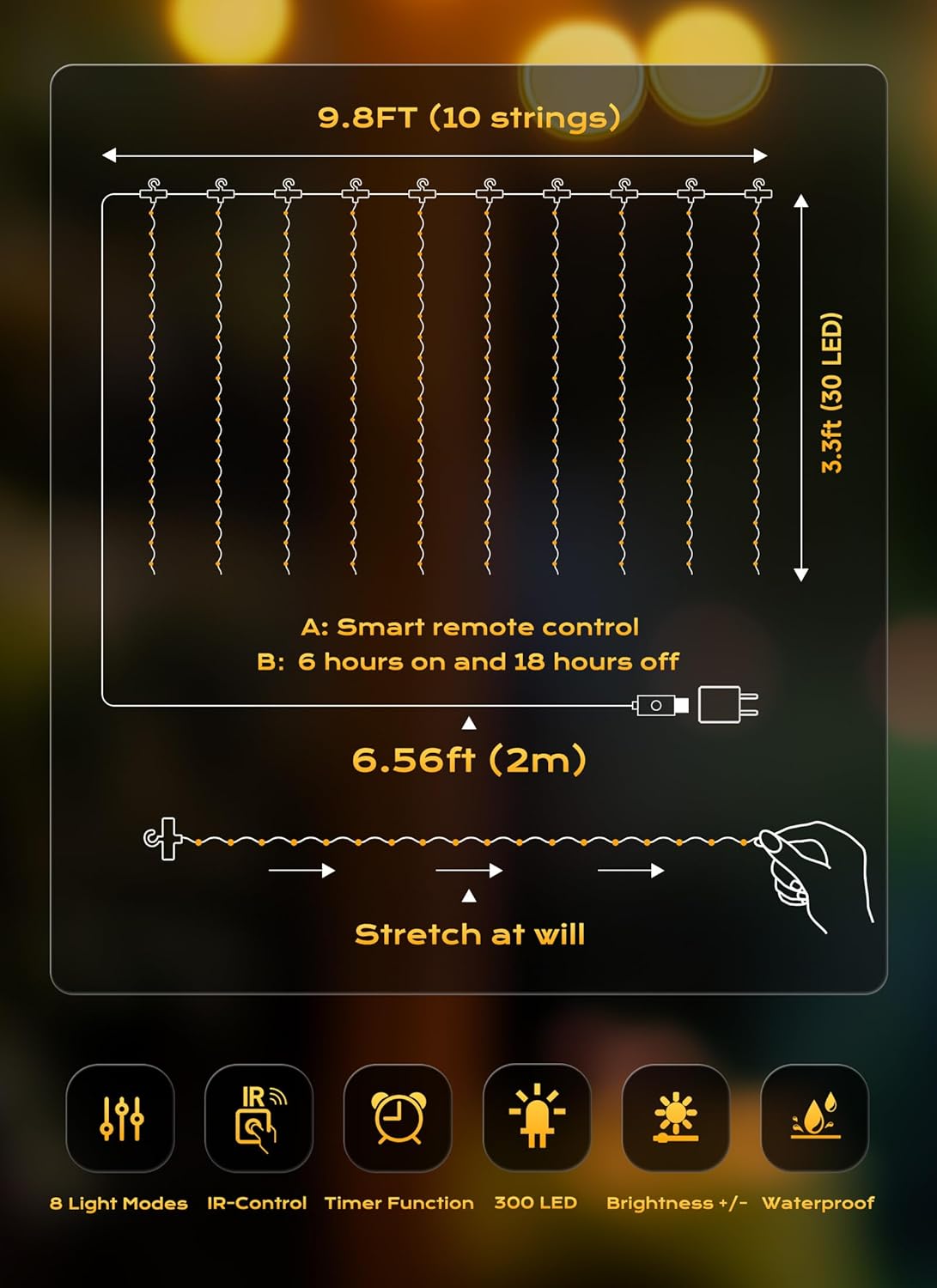 - Multifunction with remote:A. easily control the hanging lights from a distance. B. timeable: 6 hours on and 18 hours off. C. 8 display options: combination, in waves, sequential, slogs, chasing, slow fade, twinkle, steady on. D. 4 options of brightness adjustable