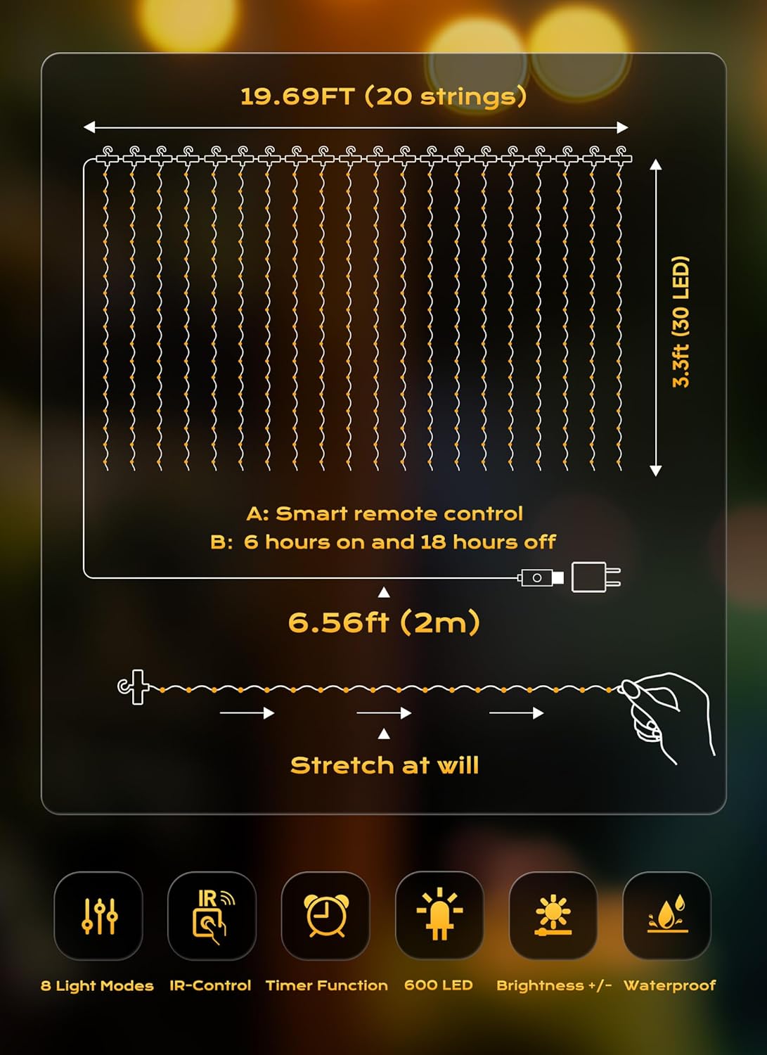 Brightown 600 LED Curtain String Lights, 20 FT Hanging Fairy Lights with Remote, 8 Modes, Waterproof Window Lights for Bedroom Backdrop Wedding Outdoor Christmas Party, Warm White