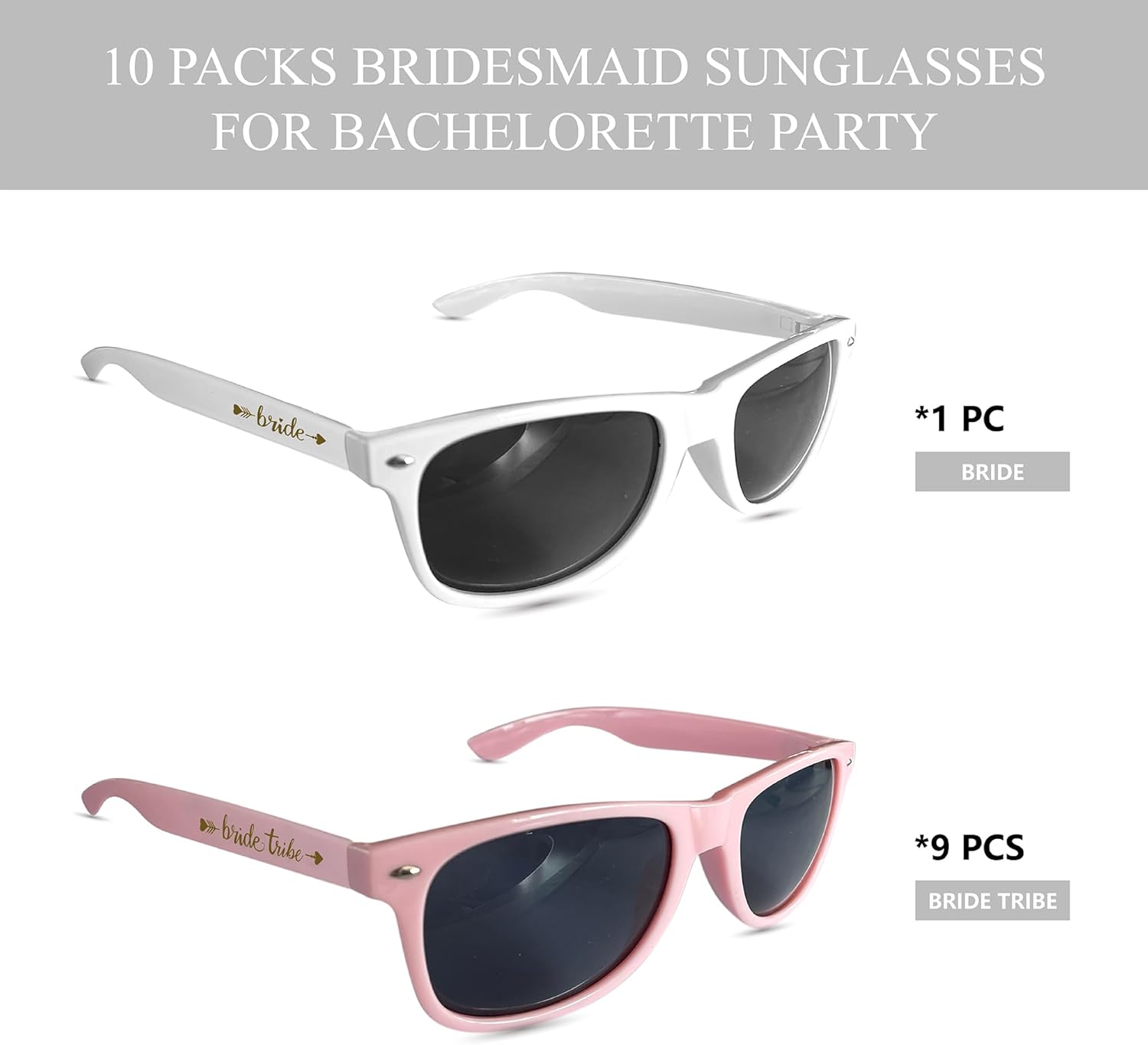 - Bachelorette Sunglasses Set---This Bachelorette Sunglasses kit contains a total of 1 Pair of white 'Bride' Sunglasses, 9 Pairs Pink 'Brides tribe' Sunglasses for bridesmaid. Great idea for Bachelorette party and bridal party.
