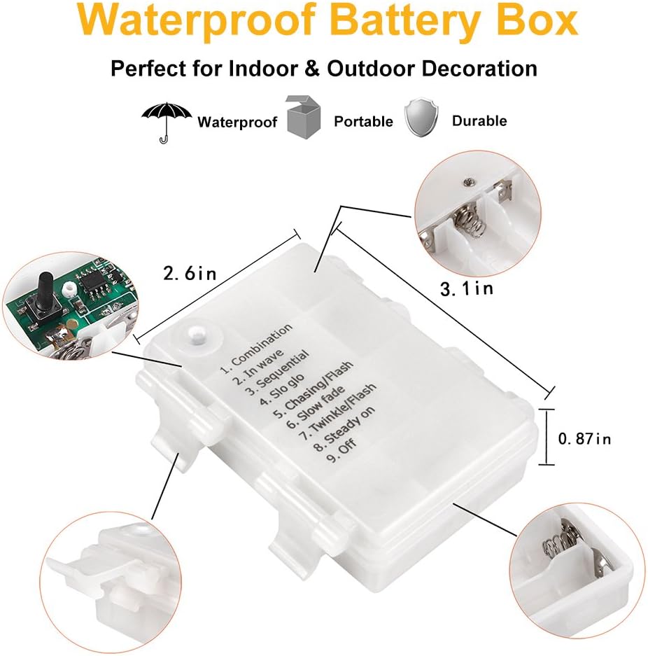 - π EASY OPERATION LED STRING LIGHTS: Press the button on the battery box to select the mode from 8 options: Combination, In wave, Sequential, Slo glo, Chasing/Flash, Slow fade, Twinkle/Flash, Steady on. Timer function will be activated as you turn the lights on, no more operation needed