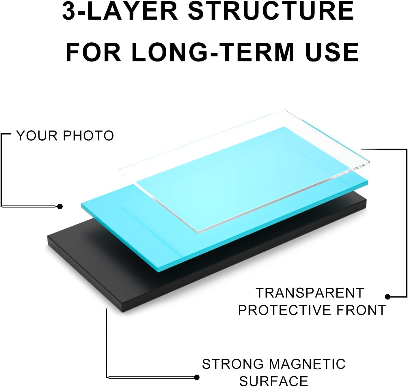 - 【Easy to Use】PLEASE PEEL OFF THE TRANSPARENT SCRATCH PROTECTION FILM BEFORE USE. You can slide your favorite 4" x 6" photos into the pockets and attach the frames to any magnetic surface. If you want to update the photos, just change them on the fridge/cabinet without taking down the whole frame.