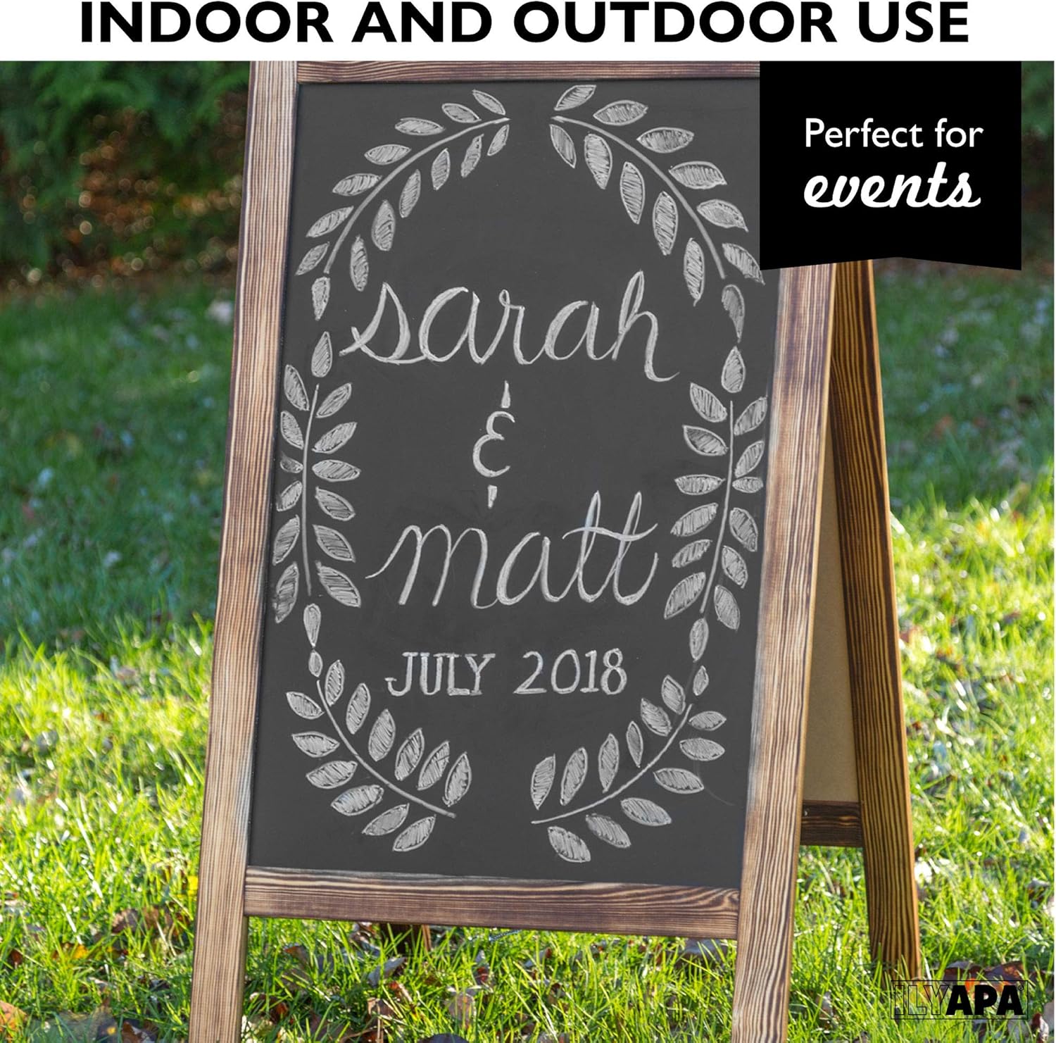- Includes eraser & chalk – This elegantly crafted wooden a-frame sign comes with a magnetic eraser and four pieces of white chalk for your convenience.