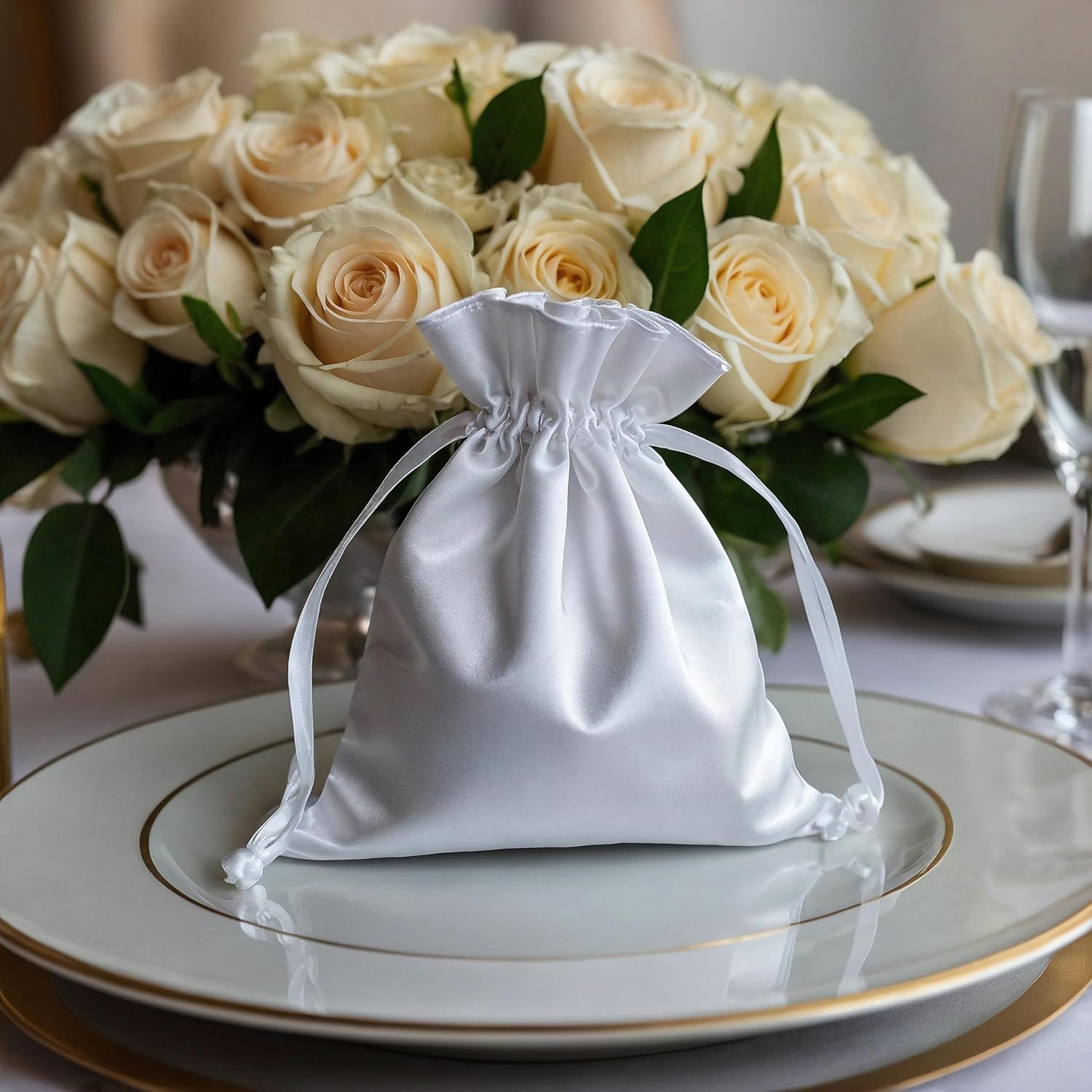 - COLOR - These White satin bags with drawstring look classy and elegant just like silk and just as smooth. Perfect for small jewelry, candies, treats, and favors. Small gift bags come in a bulk quantity of 50 bags.