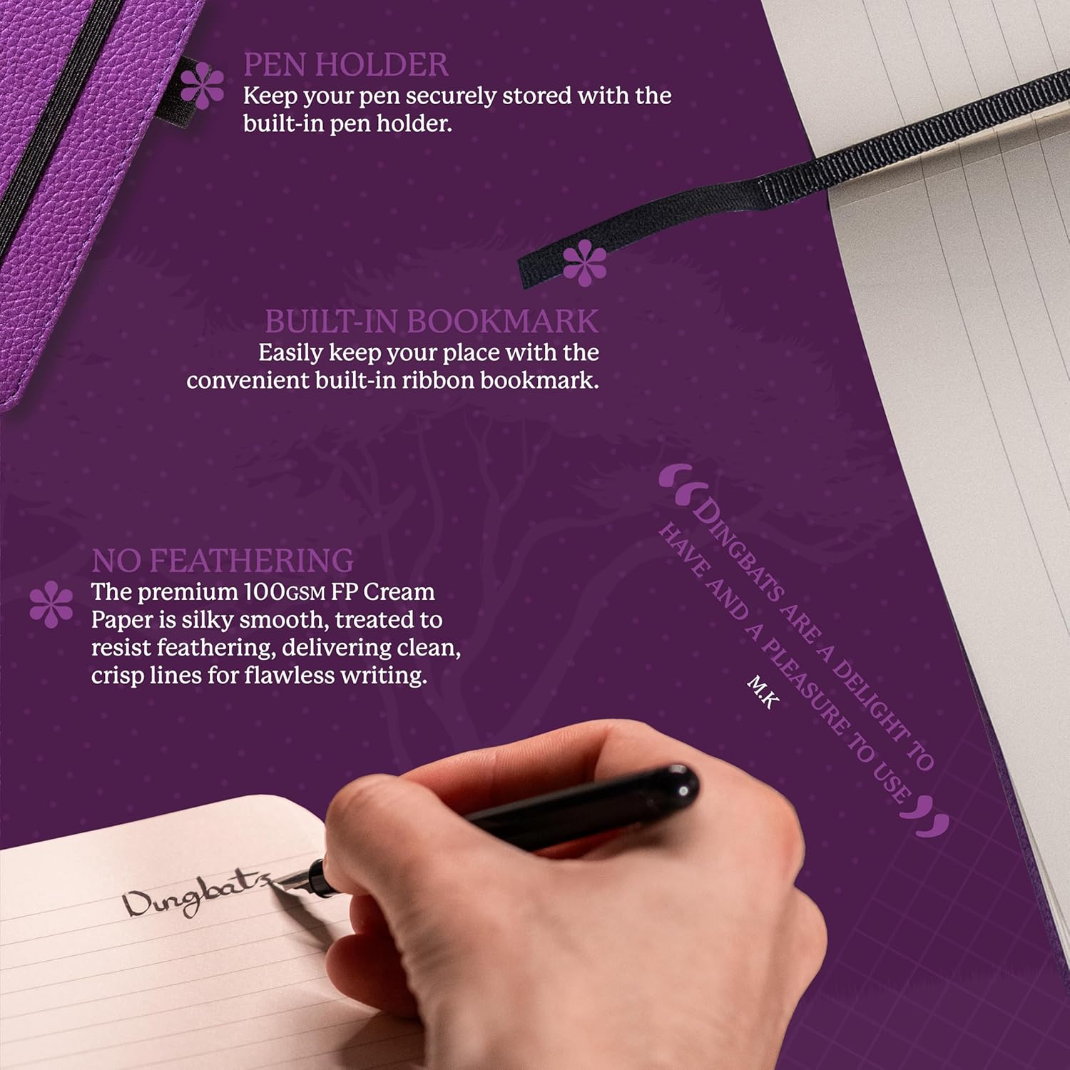 - 2. HIGHEST-QUALITY WRITING PAPER: Dingbats Purple Hippo Medium A5 Notebook Journal has 192 pages-96 sheets of no bleed, smooth writing, Cream 100gsm, acid-free fountain-pen friendly, perforated lined paper in a flat lay design