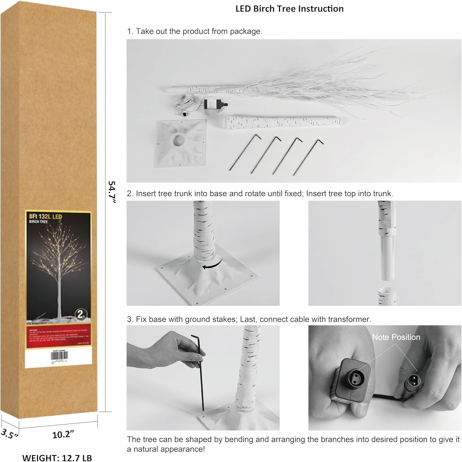 - Durable Material: Natural birch hand-paint finish covered over whole tree including branches, is more costly than only plastic tape wrapped birch trees. 8FT 132L LED birch tree, warm light, 16FT extension cord.