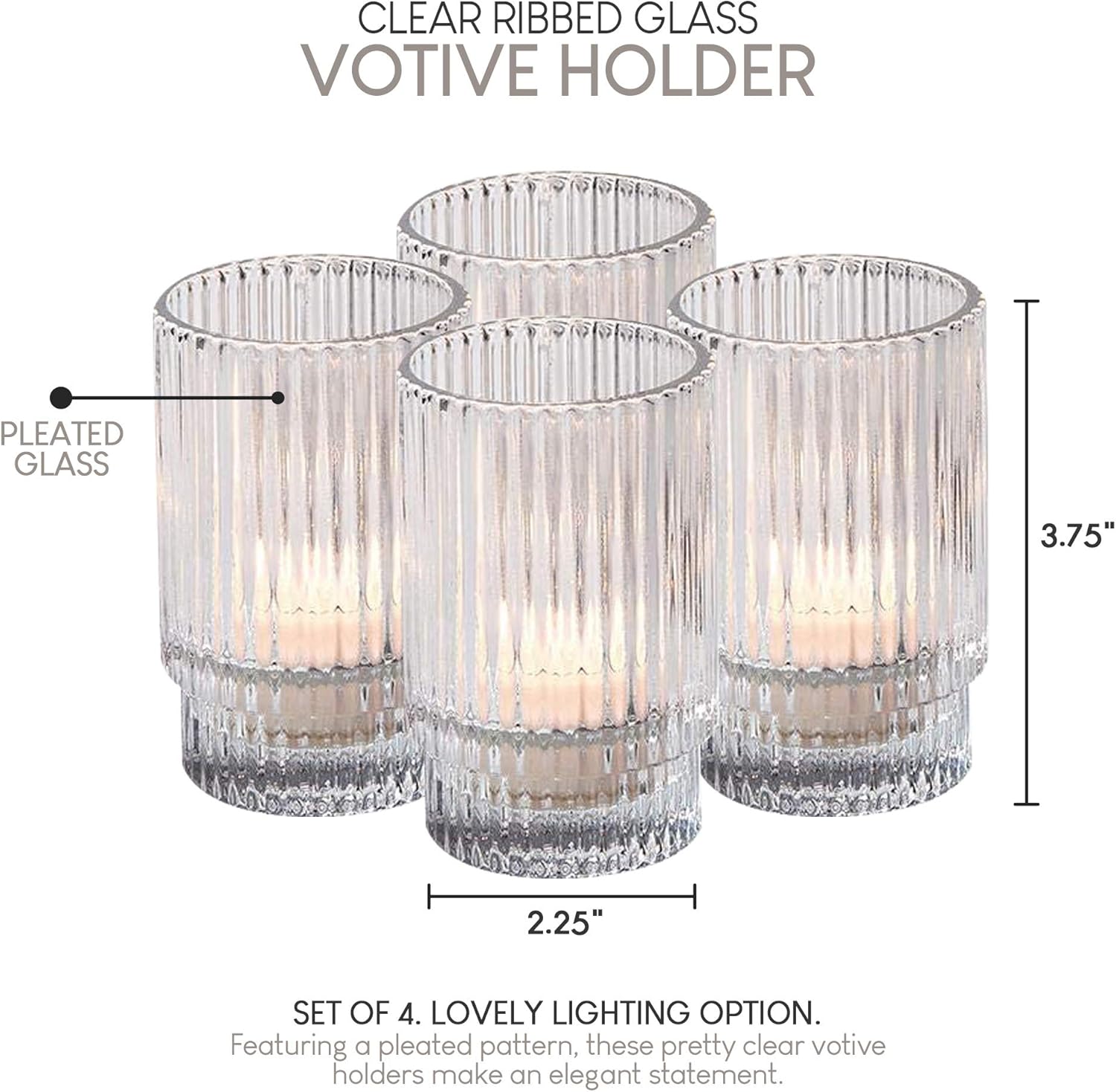 Serene Spaces Living Ribbed Glass Votive Holders – Elegant Pleated Candle Holders for Tea Lights, Votive Candles – Decorative Glass Holders for Home, Weddings, 3.75" Tall and 2.25" Diameter, Set of 4