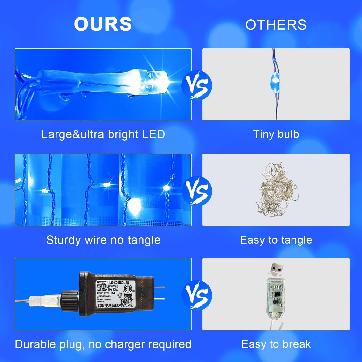 - Great Decorations for Indoor-outdoor: Our blue Christmas curtain lights are outdoor waterproof (IP44), withstand rain and snow, and are ideal for outdoor use. It can be used for outdoor decor, such as gazebos, fences, lawns, and party backdrops. These backdrop curtain lights are what you are looking for, it is so mesmerizing! Note: the plug is NOT waterproof, please put it in a dry place.