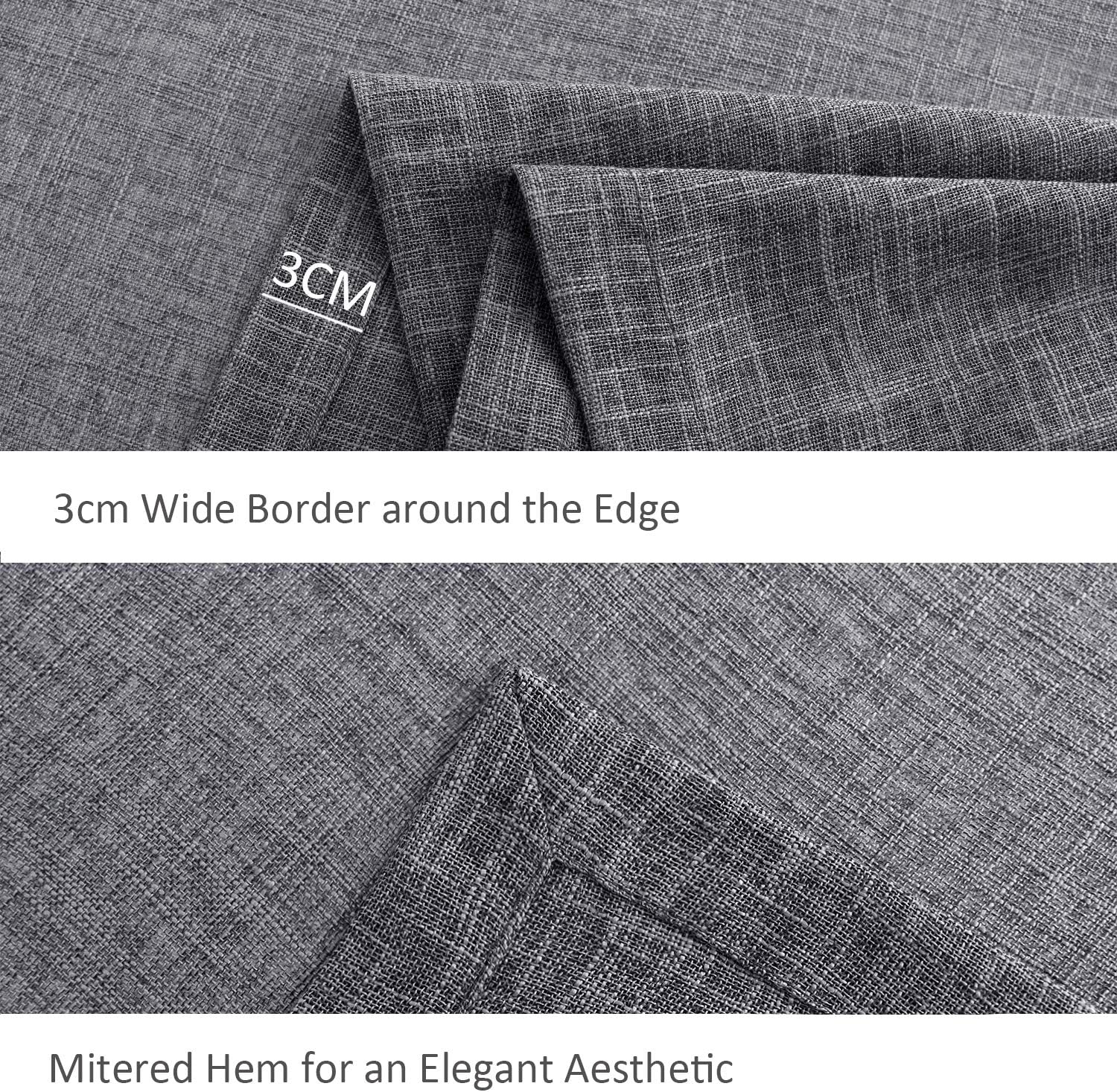 - Our table cloths are made of high-quality polyester faux linen yarn, with 2-tone slubby texture. It is more durable than real linen yet soft and supple; while protecting table surface, our tablecloth also adds a sense of understated luxury to your dining scene.