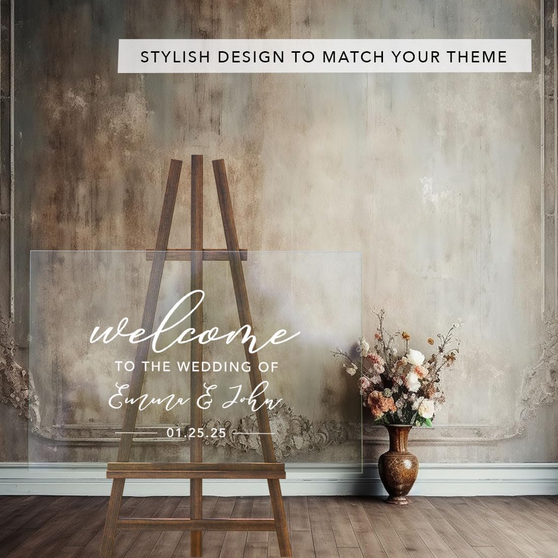 - VERSATILE DISPLAY OPTIONS Your custom names and date are directly printed onto durable acrylic with premium fade-resistant inks. Your sign is peel-proof and smudge proof. Made in USA. Our wedding entrance sign fits all sturdy easels or stands, making this wedding welcome sign without stand perfect for both indoor and outdoor use.