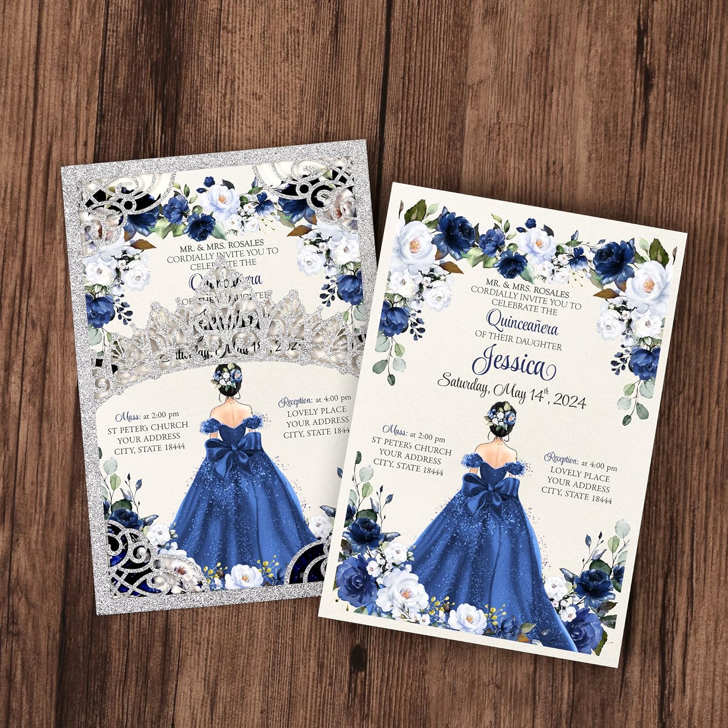 - Size: 4.8x7 inch pearlized inners with clear writing and neat layout; 5x7.2 inch laser cut glitter silver quinceanera invitation card pockets with hollow crown; 5.3x7.6 inch white post envelope.