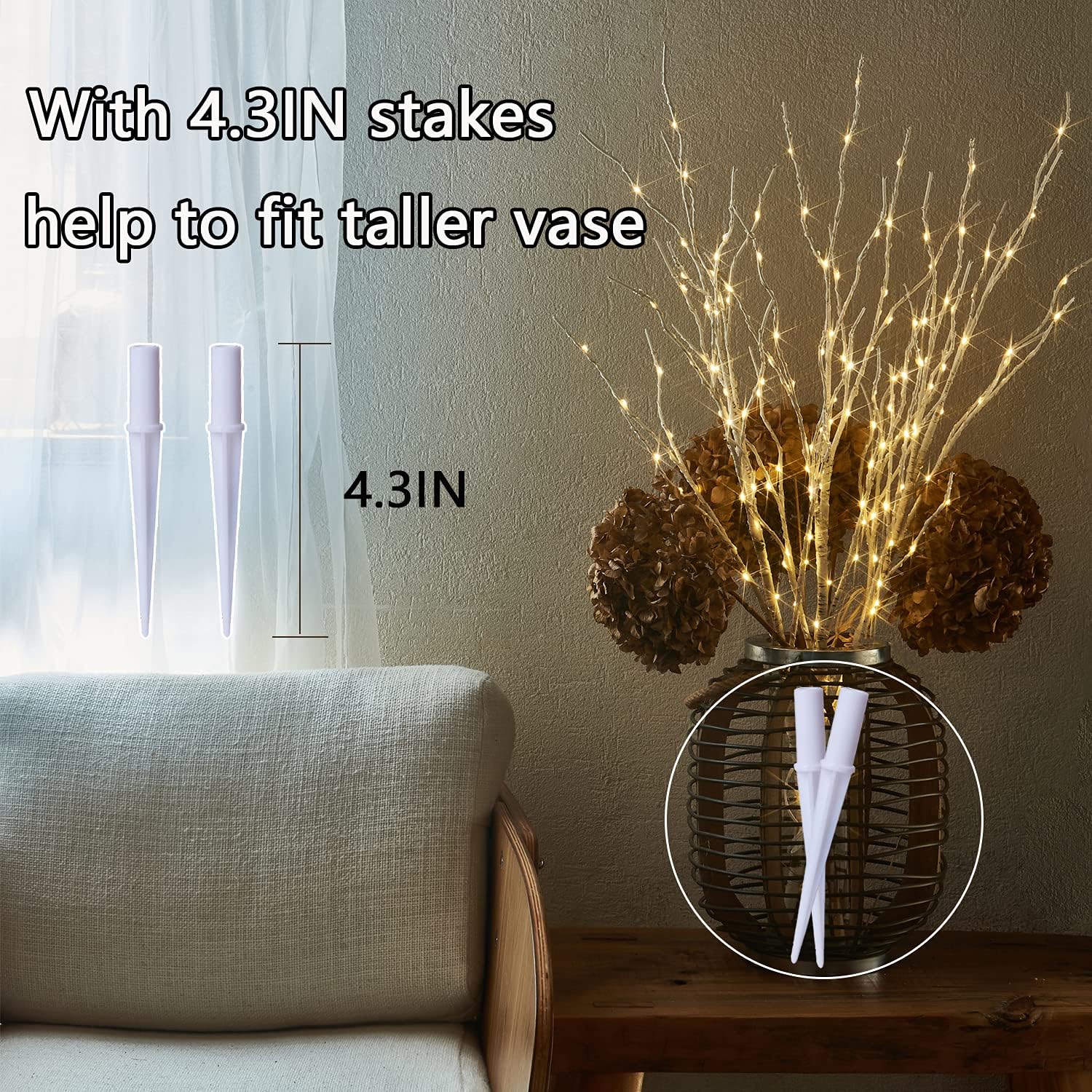 - 🎄【All-matching lighted stems】You can embellish your existing silk or dried floral arrangements with these stunning pre-lit willow branches, or use them alone for an equally dramatic look.Assembled with 2 plastic stakes helps to fit with a taller vase and make it easy to use in garden.