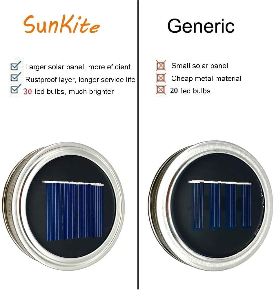 - ✨ UPDATED MASON JAR LID LIGHTS - Cozy Warm Lights, with 30 micro LED, much brighter than those 20 LED jar lights. Larger solar panel, charge more efficiently. The edge of the lid uses rustproof material instead of cheap alloy, you would find it more durable in humid weather.
