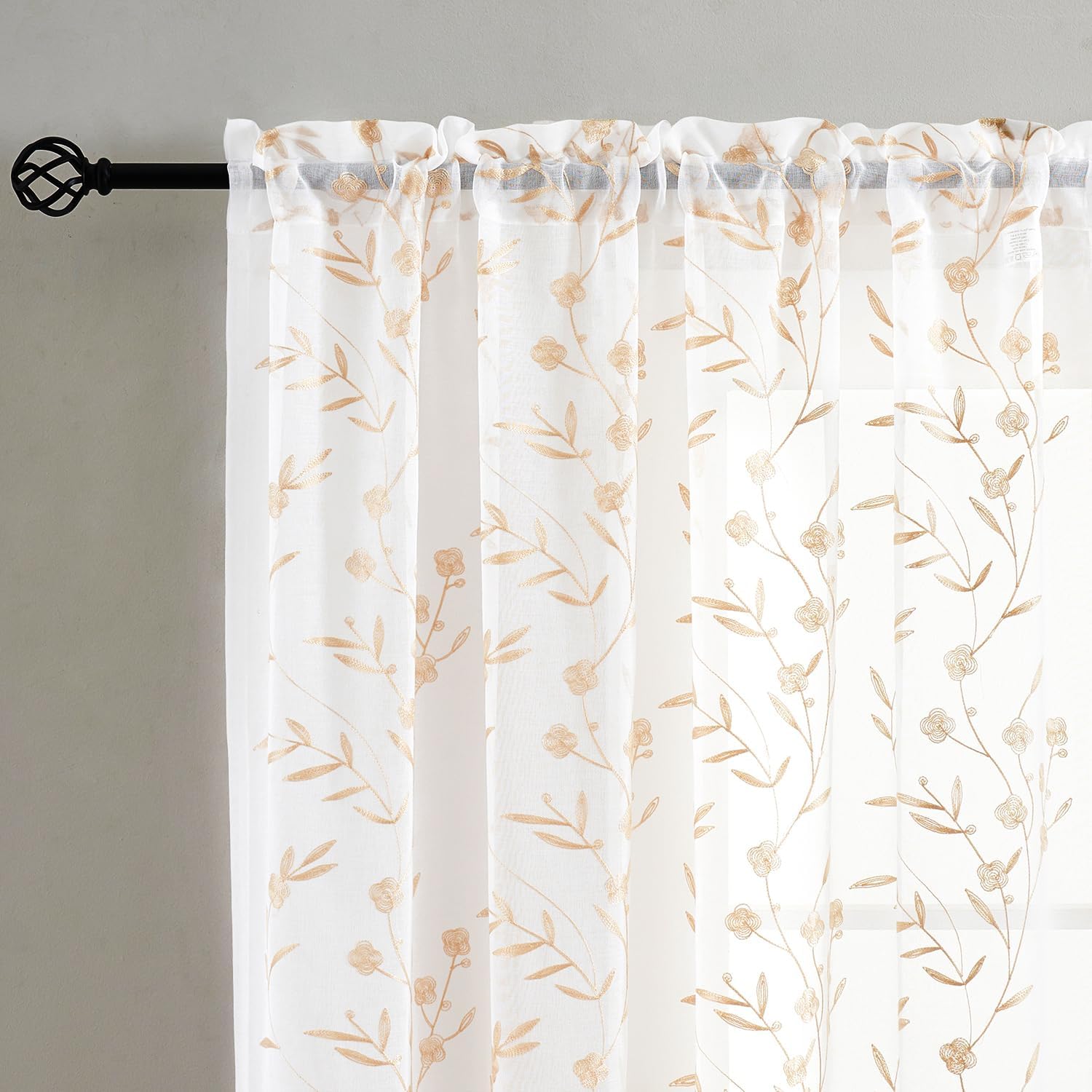 Sheer Curtains White-Beige 95 Inches, Embroidery Floral Pattern Window Treatments Rod Pocket Drapes for Living room, Bedroom, Semi Voile Curtain Panels for Patio, Villa, Parlor, Set of 2, 52"x 95".
