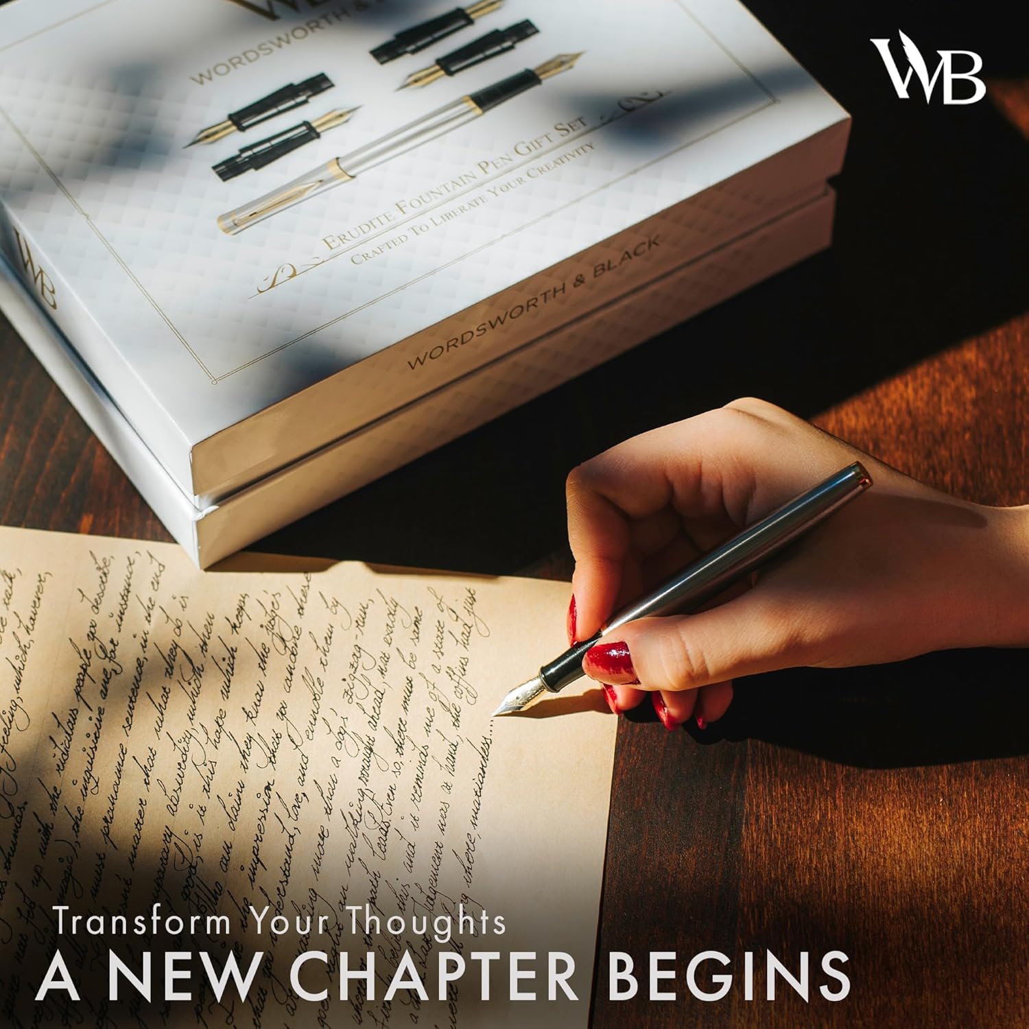 Wordsworth & Black Fountain Pen Gift Set, Includes Bottle, 6 Cartridges, Refill Converter, 4 Replacement Nibs, Premium Package, Journaling, Calligraphy, Smooth Writing Pens [Black Gold]