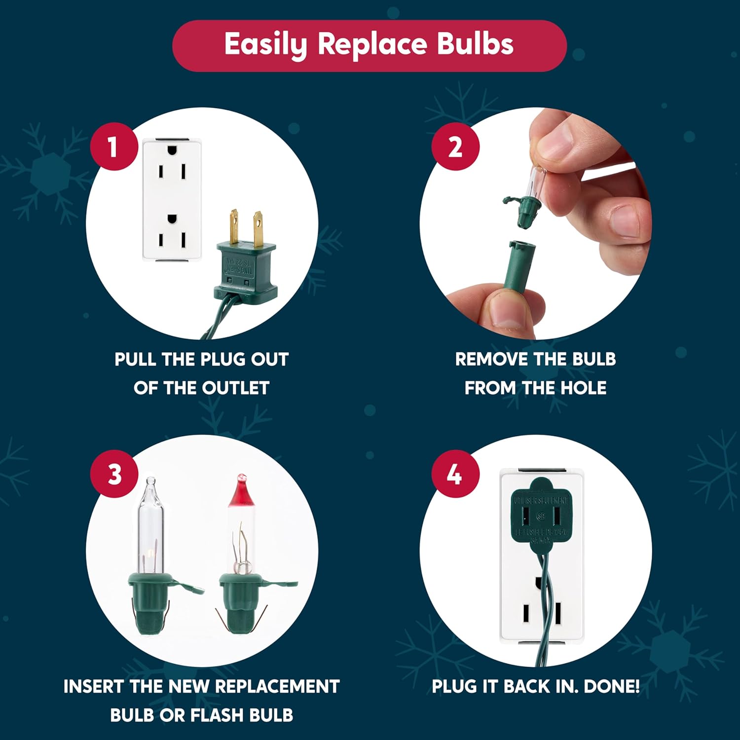 - INDEPENDENT CIRCUIT & REPLACEMENT BULBS - Enjoy a hassle-free holiday! Our lights feature an independent circuit system; if one bulb burns out, the rest stay lit. The set includes 9 spare bulbs, 3 replacement fuse, and 9 test flash bulbs., ensuring your display stays bright throughout the season without needing a full replacement.