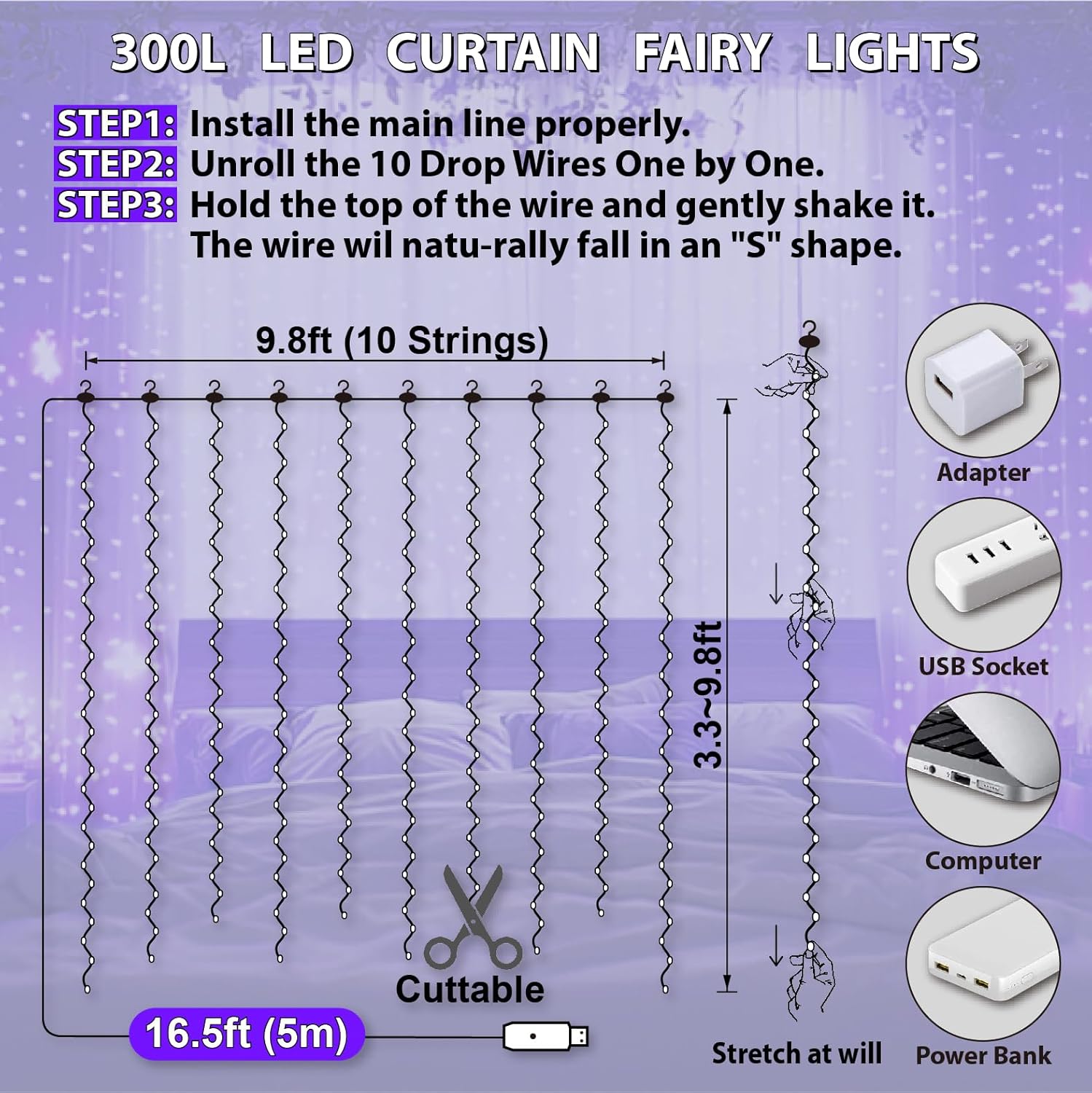- 16.5 Ft Lead Wire: 300 individual LEDs, 9.8ft.x9.8ft curtains lights come with extra 16.5ft long power cord; 9.8ft main strand and 10 drop strings included hooks; Copper wire drop strings is tough and flexible, hanging and adjustable desired height naturally easily; No limits to your imagination, Do the shape you like; Enjoy a fairytale world (Curtain is NOT included)