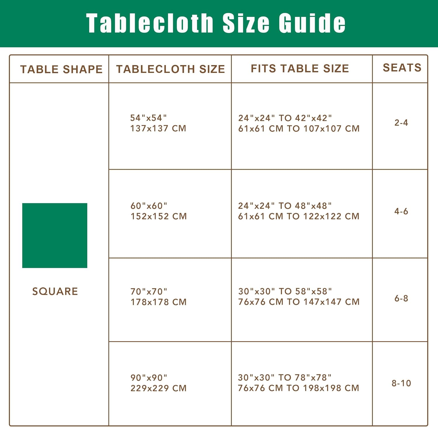 - Size Guide & Package: You will receive a 90"x90" square tablecloth. Please measure the length and width of the table before ordering! This tablecloth is very suitable for square dining tables with dimensions ranging from 30"x30" to 78"x78". Select based on your desired look