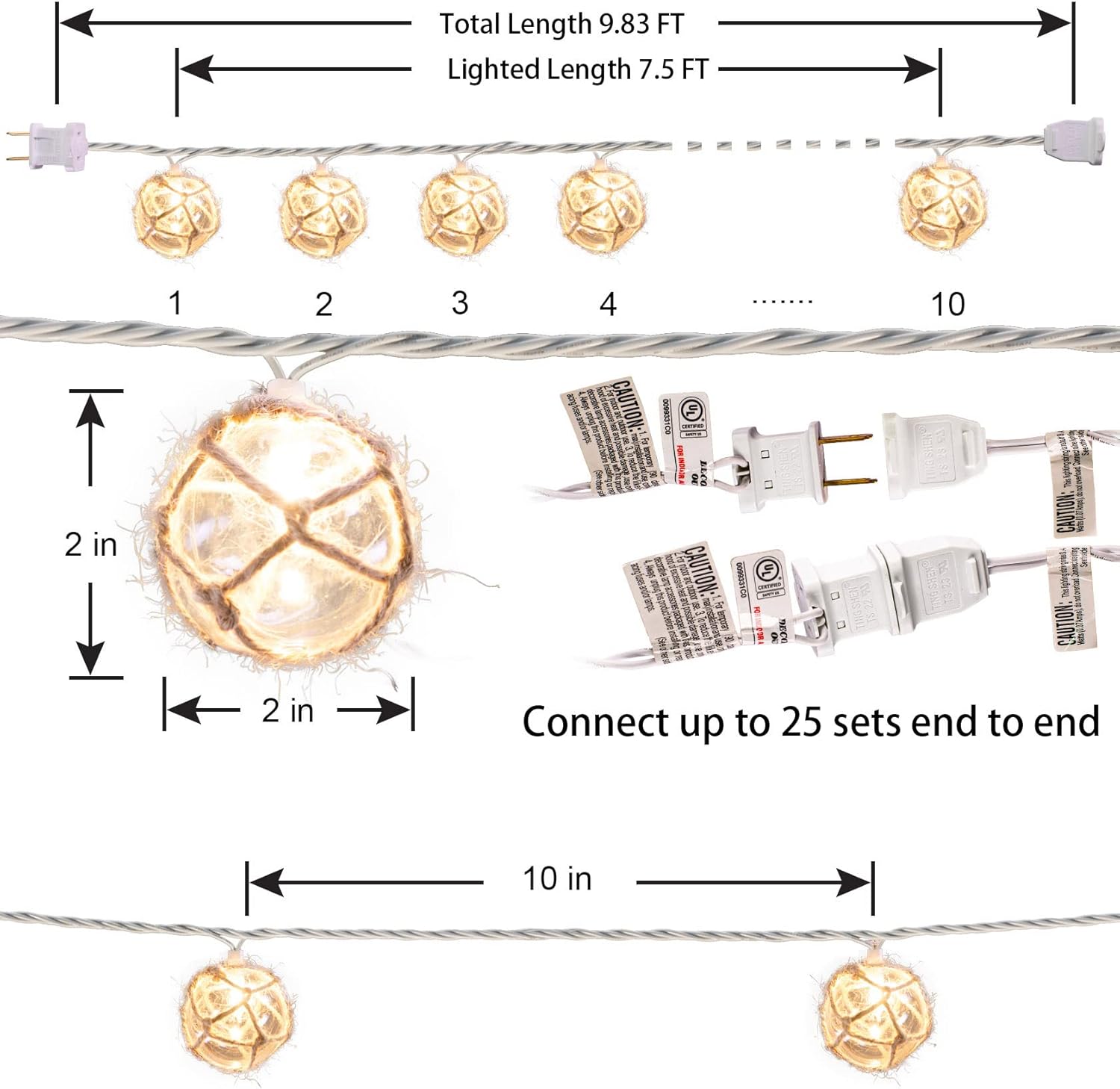 - 【10 Fishing Clear Nautical Ball Fairy String Lights Plug in】These clear string lights on a 9.83 feet string. The distance of lighted length from the 1st ball to the 10th ball is 7.5 feet. The lead wire spacing is 24 inch, the tail plug spacing is 4 inch. Each fishing ball is 2 inch. The buoy float string lights can be connected up to 25 same sets end to end.