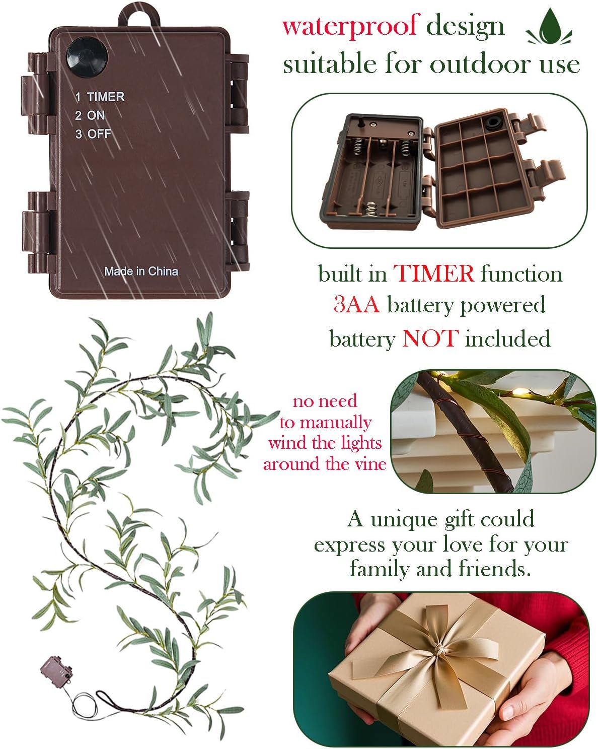 - π Timer Fuction: Battery operated olive garland and with a built-in auto-timer, this lit twig garland lights up at the same time every day, runs for 6 hours and then turns off automatically for 18 hours.