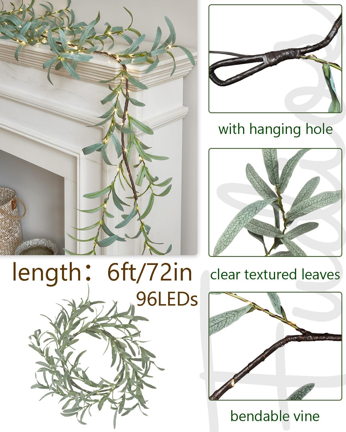 Fudios Lighted Olive Garland Battery Operated with Timer 96 LED Fairy Lights 6ft, Mantle Fireplace Vine Garland with Lights for Spring Easter Decoration Christmas Valentines Wedding Party