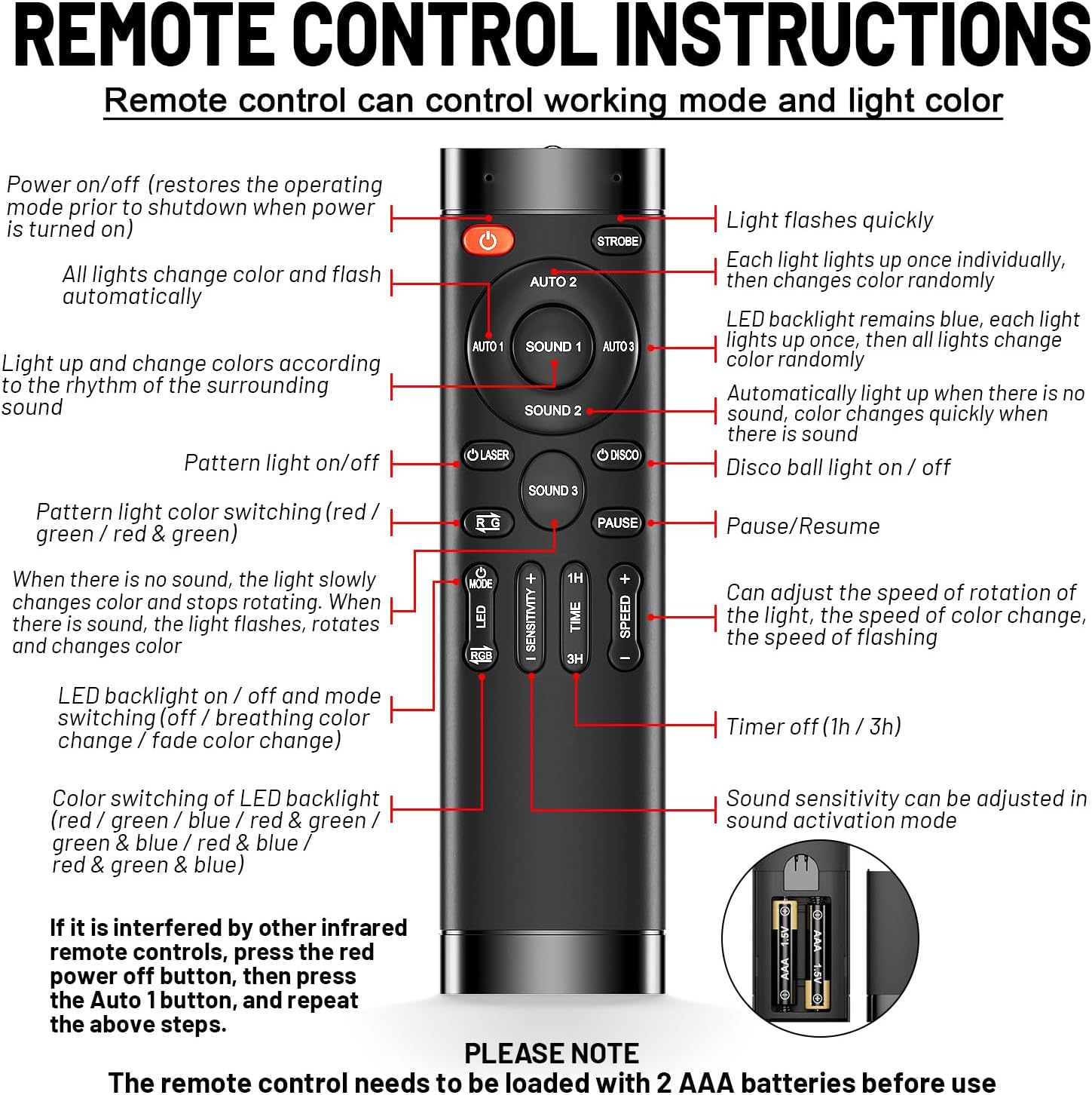 - Remote control and memory functions π± When the party disco light is enabled, it will automatically restore the working mode before shutting down. The disco party light comes with a remote control, you can freely turn on/off any lens light, change the lighting mode, speed, sensitivity, the party light also has an automatic off timer, you can set it to turn off after 1 or 3 hours.