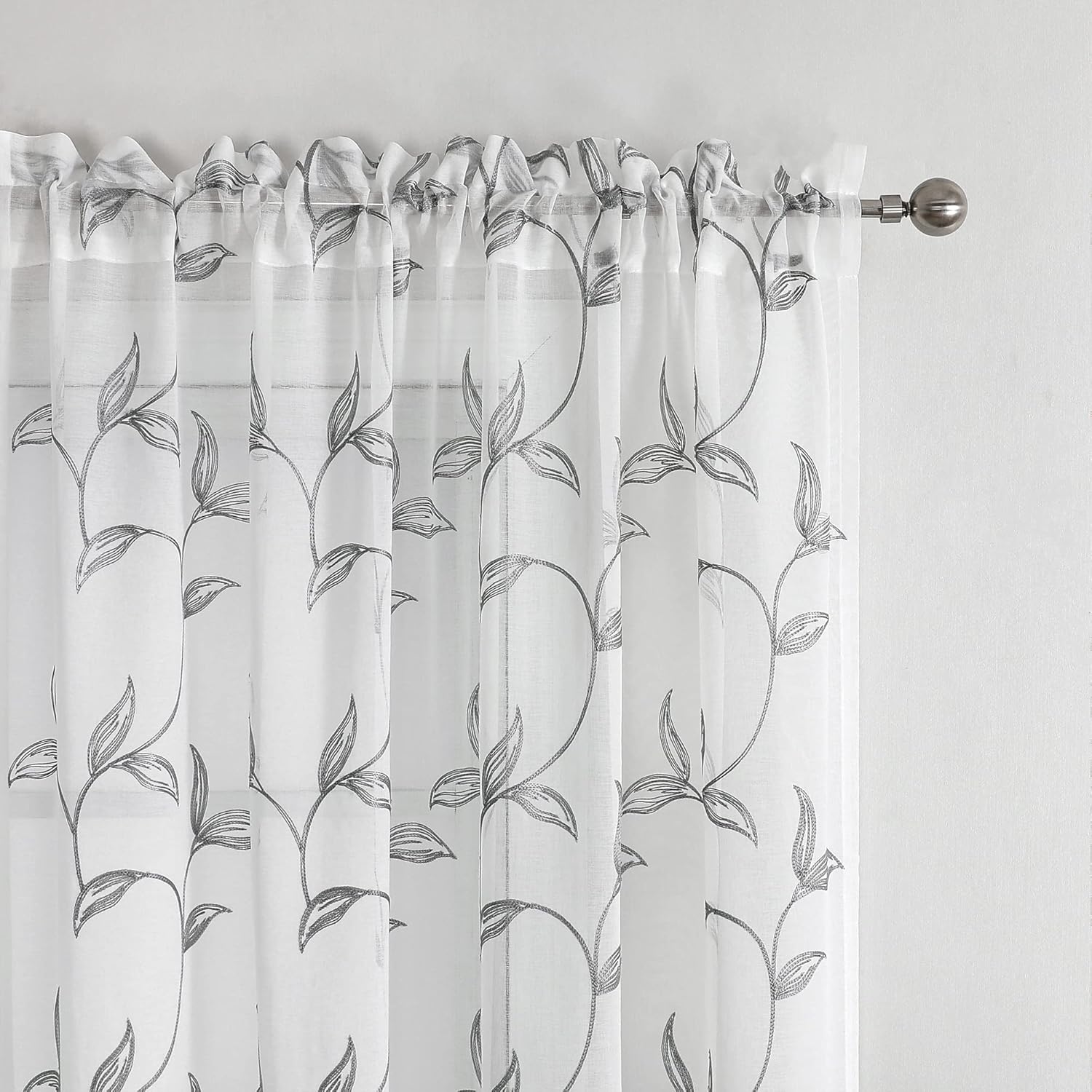 VISIONTEX Sheer Curtains 95 Inch Length 2 Panels, Decor Iron Grey Vine Leaves Embroidery on White Voile Pair, Accent Semi Window Drapes for Kitchen, Living Room and Bedroom, 54" W x 95" L