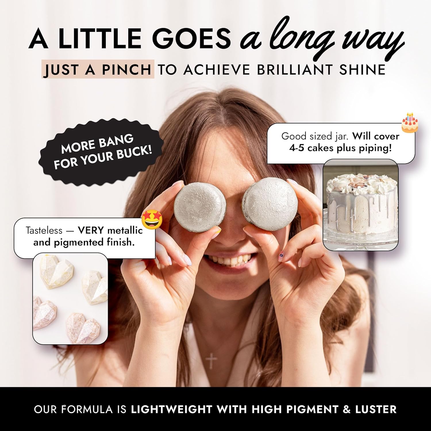 • EASY TO USE: Our white luster dust is incredibly versatile. Apply with a wet brush, airbrush, or dry brush, and even mix into beverages. Achieve professional-looking results effortlessly at home, whether decorating halloween cakes or adding shimmer to cocktails.