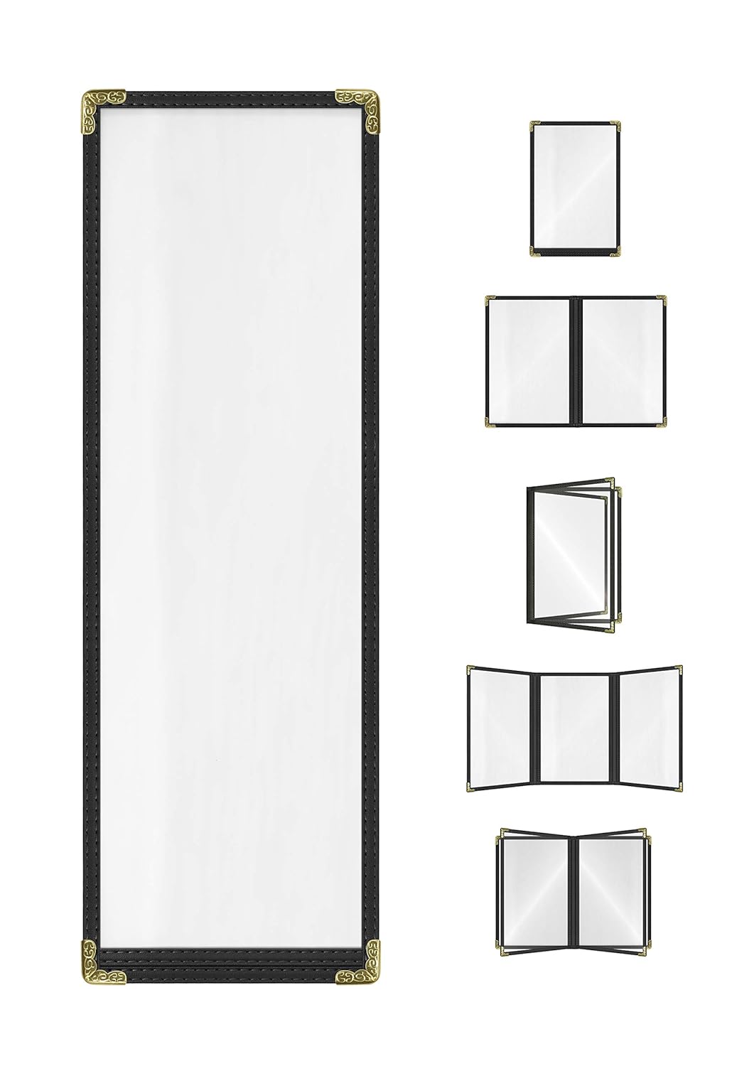 - High-Quality and Durable Construction: Made from crystal clear vinyl, these menu covers protect your pages from spills, stains, and everyday wear while maintaining vibrant visibility. The black double-stitched edges ensure durability, and the gold decorative corners enhance the professional and polished look.