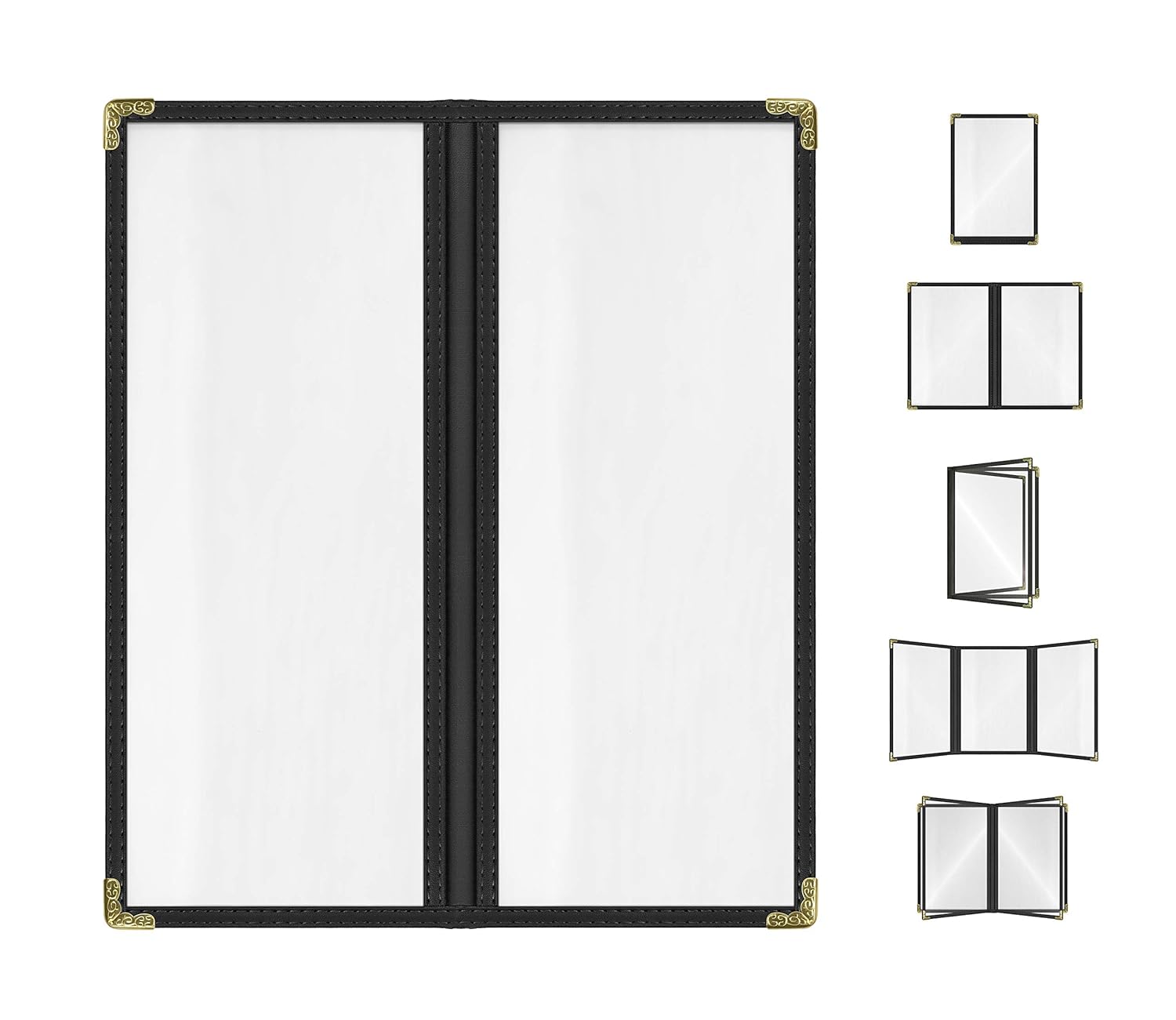 - Durable and Protective Vinyl Construction: Made from crystal clear vinyl, these covers provide excellent clarity while protecting your menu pages from spills, stains, and general wear and tear. The double-stitched edges ensure long-lasting durability, while the gold decorative corners add a stylish, refined touch to your menu presentation.