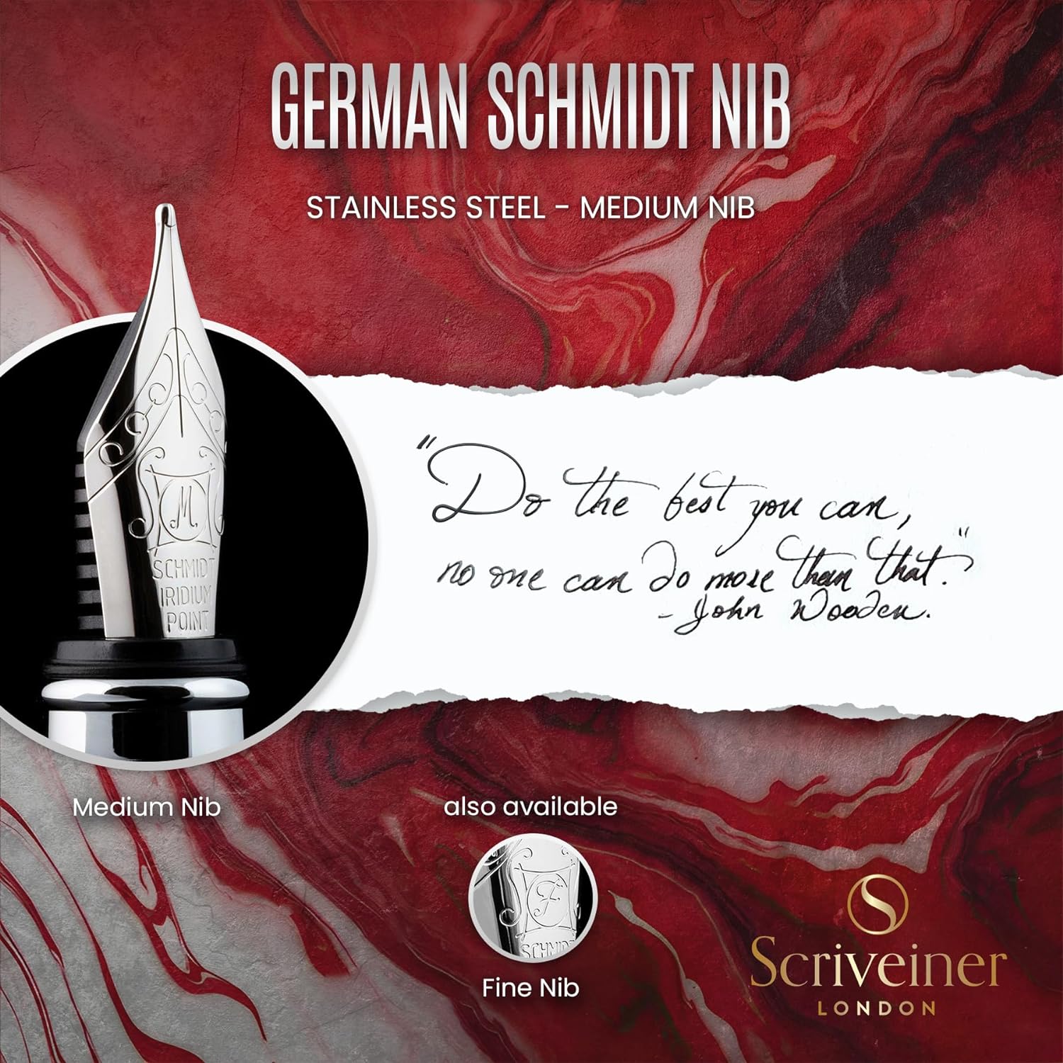 Scriveiner Deep Crimson Red Fountain Pen - Stunning Luxury Pen with Chrome Finish, Schmidt Nib (Medium), Best Pen Gift Set for Men & Women, Professional, Executive, Office, Nice Pens