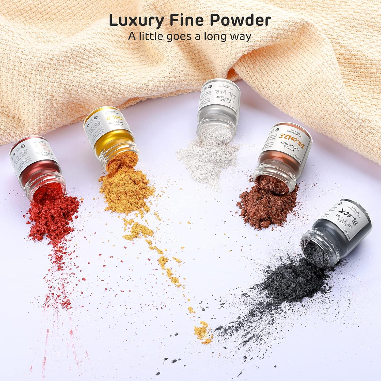 - LUXURY CAKE DUST -- Fine texture dust powder with shimmer result, this elegant luster dust helps to create high luster/glitter effect and adding a vibrant metallic finish to your project. With variety of colors to choose, gold dust is the most common colors, but the rose gold, silver, pink, bronze, Burgundy, pearl white, purple, teal and black also looks amazing