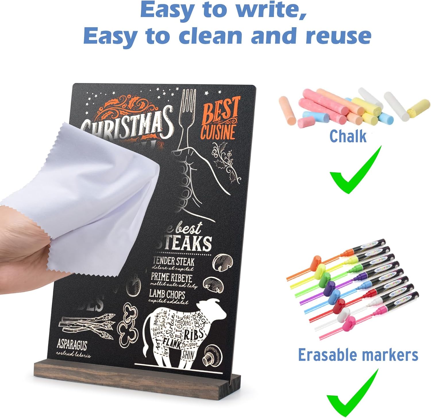 - 💖 SET OF 6 WITH CHALK MARKER: Package include 6 tabletop chalkboard signs with wood bases + 9 colors marker + 2 cleaning cloth+ 2 clips . Our double side mini chalkboard signs for tables have two ways of placing - Horizontal or vertical, you can have one more a choice.