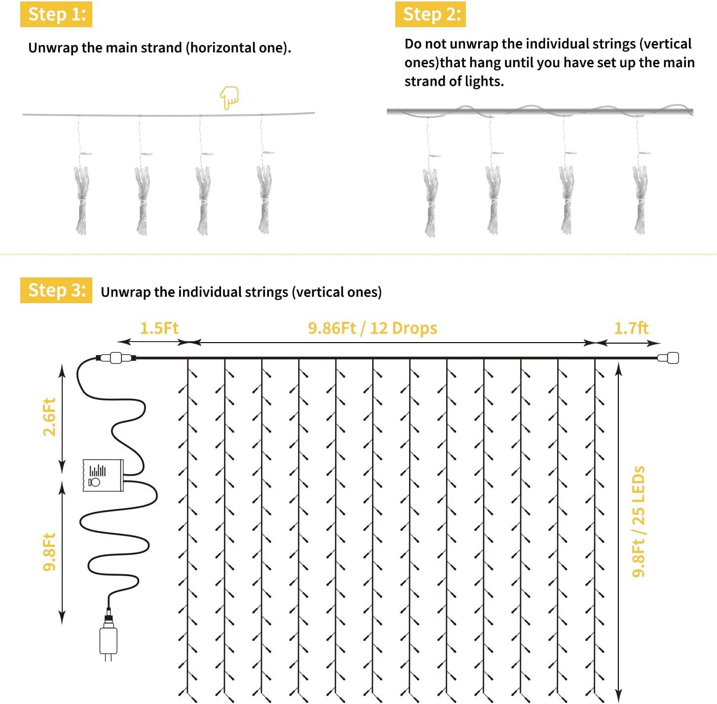 - Connectable - 4 window lights strings connectable to cover a larger area. Please only keep the controller on the first set when strings are connected so that you can control these curtain fairy lights at the same time with one remote