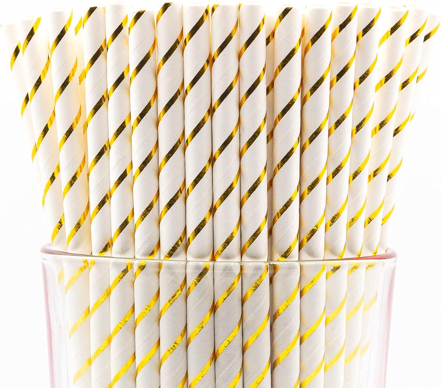 - Pack of 900 Gold Stripes Foil wrapped paper straws that are 7.75” long and have a diameter of 0.25”. Made with 4-ply paper which translates into thicker and more resilient straws that won’t wilt or change shape in both hot and cold drinks.