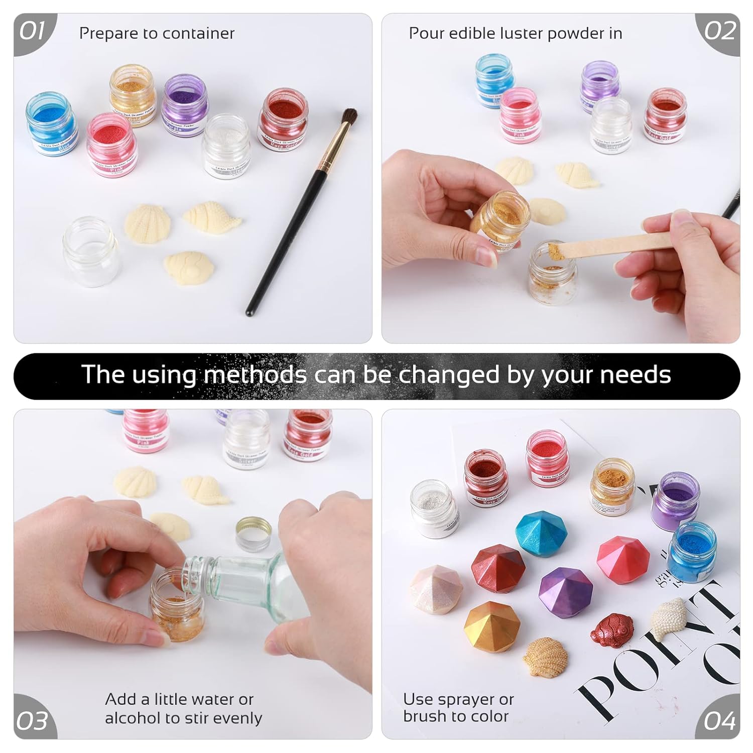 - 【Widely Used】Food-grade glossy cake decoration dust, shimmer luster powder is very suitable for chewing gum paste or fondant fudge, metal finish, fudge/chewing gum, chocolate, pull candy/isomaltose, drinks, etc.,