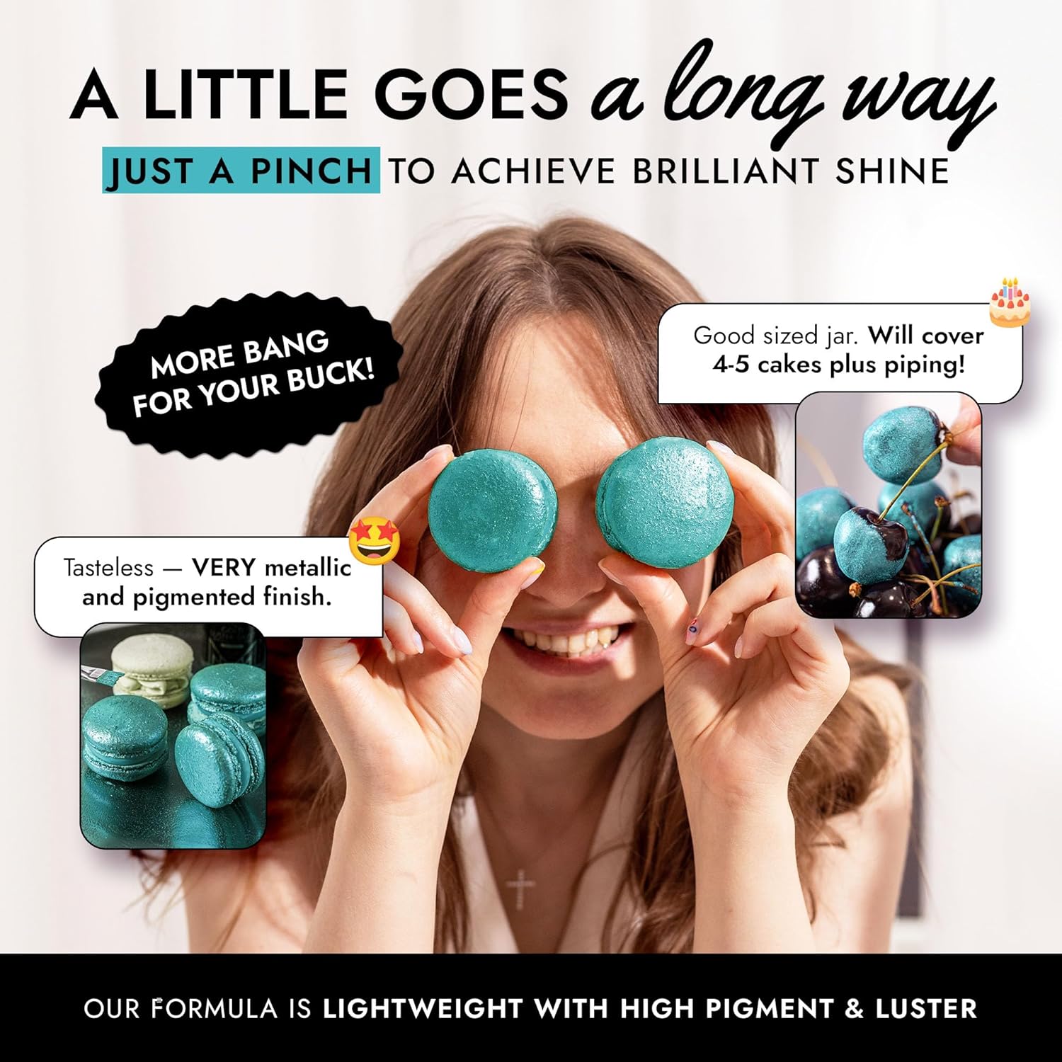 - EASY TO USE: Our teal blue luster dust is incredibly versatile. Apply with a wet brush, airbrush, or dry brush, and even mix into beverages. Achieve professional-looking results effortlessly at home, whether decorating halloween cakes or adding shimmer to cocktails.