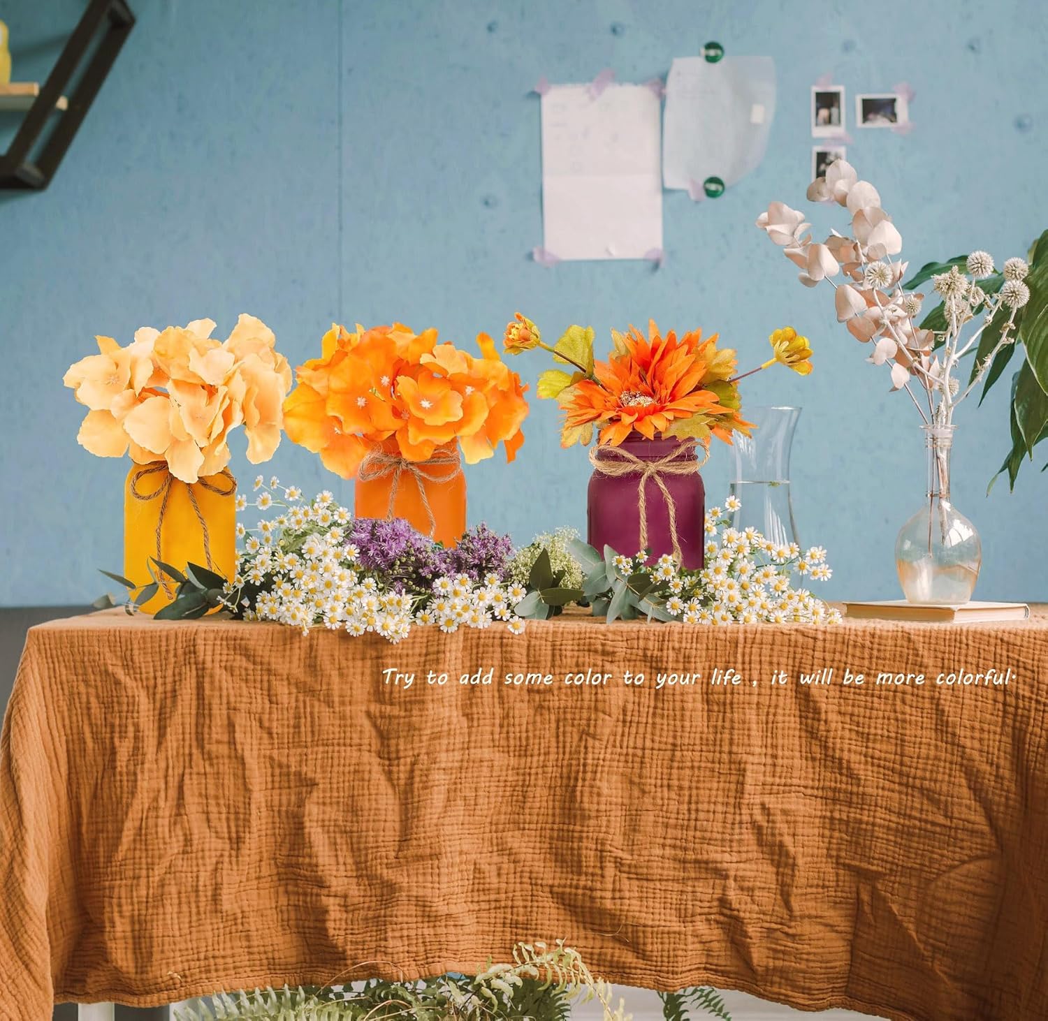 - MASON JAR WITH FALL COLOR β Add a luxurious feeling to your special fall and thanksgiving celebration by this beautiful fall color mason jars with flowers. Sharing this beautiful time with your family and friends and make your holiday chic and elegant. Show your welcome to fall and thanksgiving.