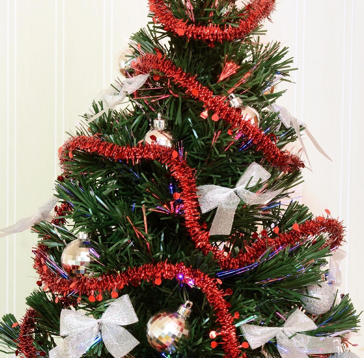 - Festive Green Tinsel Trim Ribbon: The miniature tinsel garland is ideal for creating a photo prop backdrop, decorating wedding centerpieces, wreaths, and bushes, hanging ornaments, adding bling to floral arrangements, & wrapping presents.