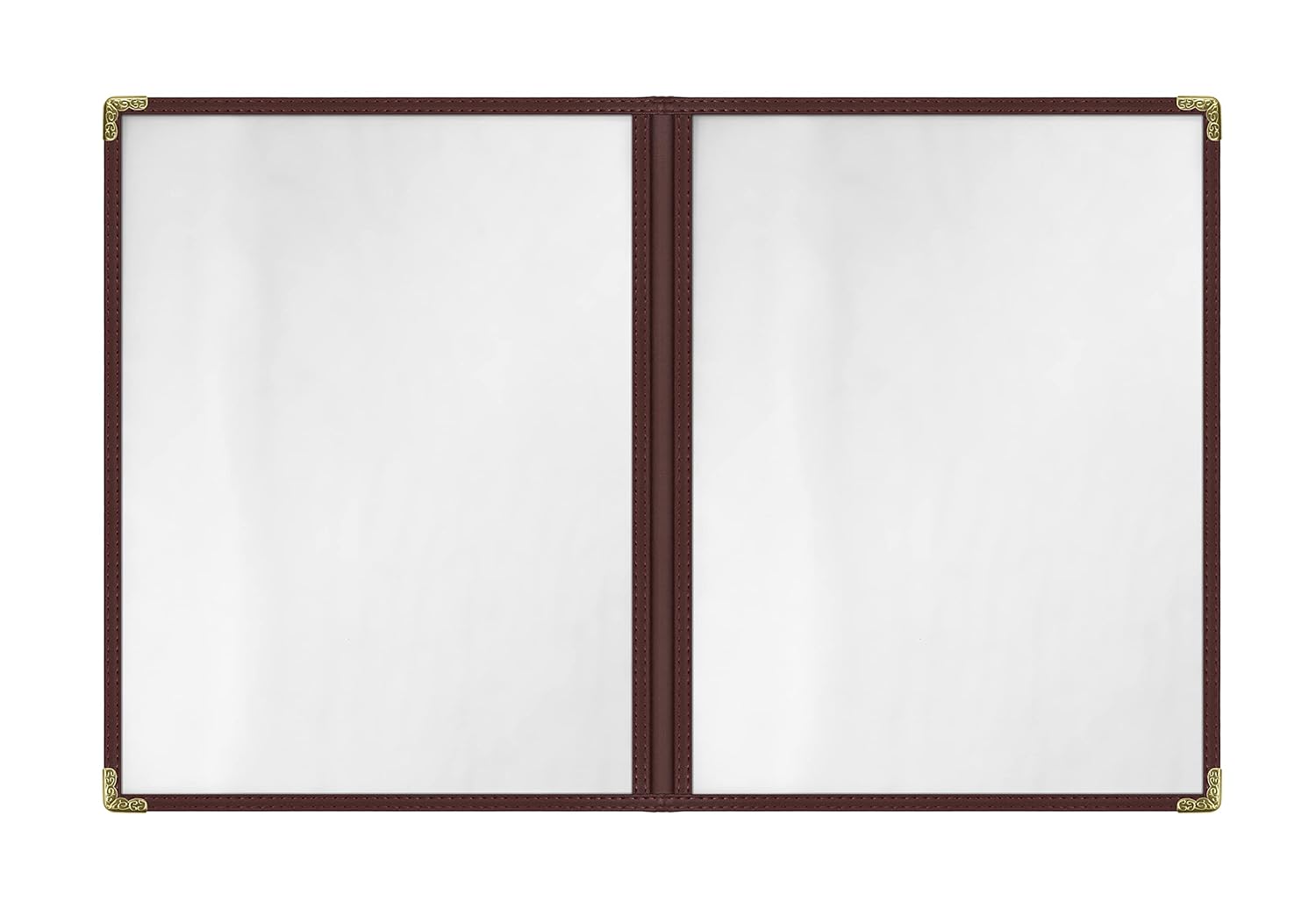 Goodsmart Restaurant Menu Covers - 25 Pack Brown 8.5" x 11", 2-Page/4-View, Side-Loading Vinyl Menu Holders, Clear Sleeves, Double-Stitched Edge, Leather-Style Café Menu Covers with Gold Corners