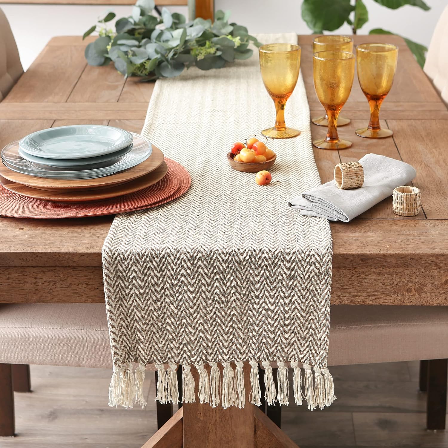 - TIMELESS DESIGN: Like a favorite knit sweater, the runner has lots of texture and full of detail, fringed edges have a casual look that works with any style of dishes