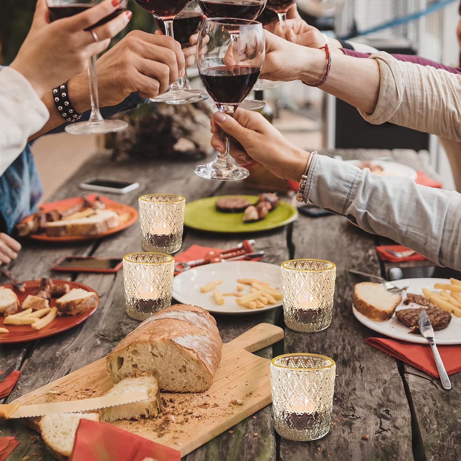 - Gold Rim Glass Candle Holder: 12 pcs clear glass candle holders set with elegant rim. The studded knobby glass let the light being scattered, making them much more interesting than simple votive candle holders