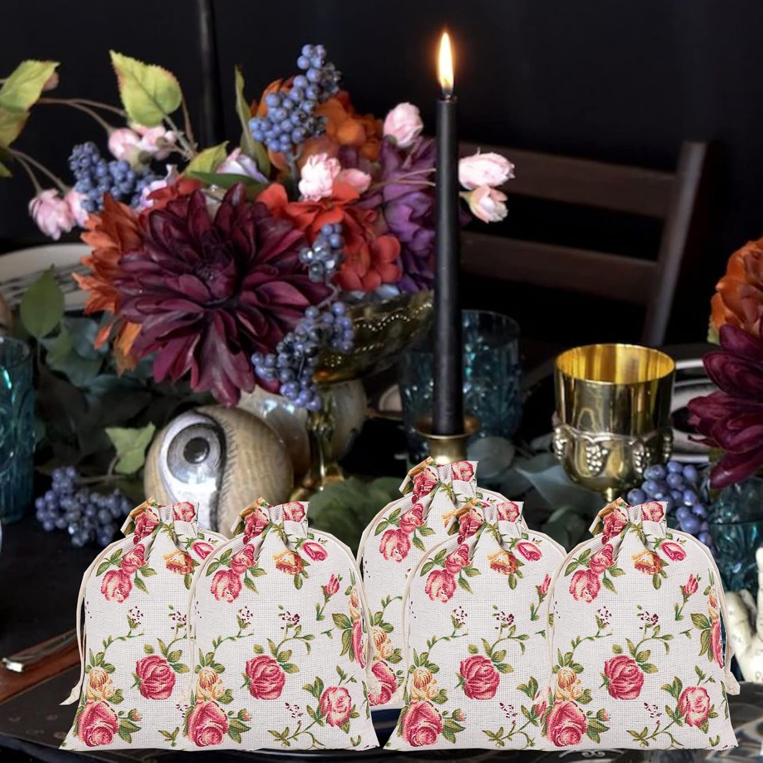 Rose Peony Flower Gift Treat Bags Drawstring Gift Bag Vintage Floral Favor Goodies Bag for Birthday Party ,Mother's Day, Valentine's Day, Wedding,Bridal Shower,Spring Easter Party Decorations