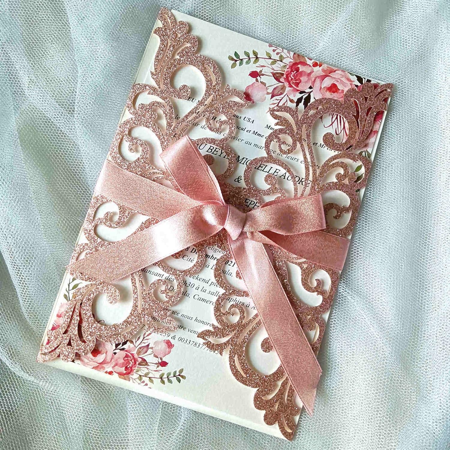 25PCS Rose Gold Laser Cut Wedding Invitations Cards with Envelopes,Blank Inner Sheets,Ribbons for Wedding Bridal Shower Quinceañera Engagement Birthday Invites, rose gold glitter
