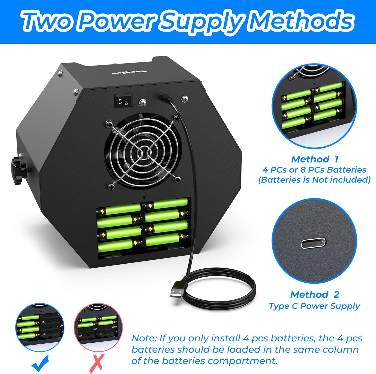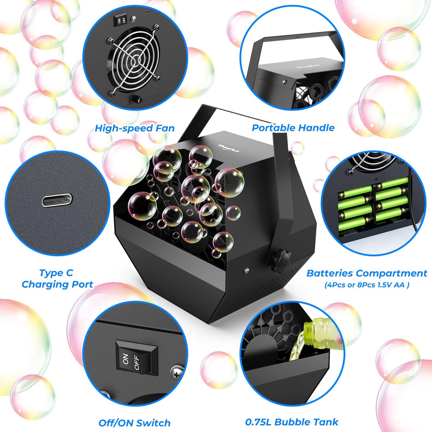 - Two-Ways Powered: The bubble blower can be powered by 4 or 8 Batteries (Not Included) or a Plug-in with the included type C USB cable, providing maximum convenience for you and letting you enjoy the bubble machine indoors and outdoors.For a good bubble atmosphere experience, we recommend using 8 batteries or plugging USB into a power source.