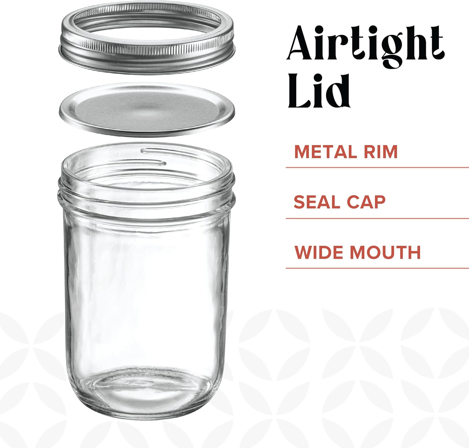 - Wide mouth 16 oz glass mason jars allow easy scooping, cleaning, and pouring sauces or dressings